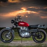 Keeping with the red theme, the stock hubs were powder coated to match and then re-laced to the original rims, these were then fitted with the popular Continental TK80 Dual sport tire. To keep the Triumph road legal and night time friendly a 5.5″ Bates style bottom mounted headlight was fitted, with the ignition switch and all the associated wiring relocated to under the tank.