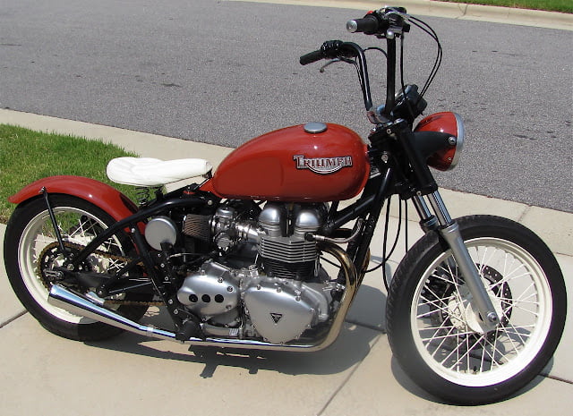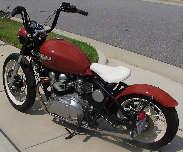 Attached are a couple of photographs of the 2007 Bonnie belonging to my wife that I used to create the Bobber Kit. The kit is a complete bolt on with no welding. I designed it to be as garage friendly as possible. I know that this particular style is not for everyone but I really enjoyed developing it.