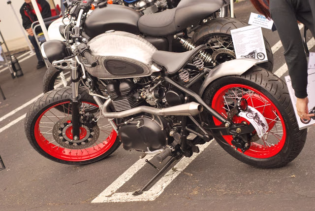 I posted a pic of a very nice red wheeled Triumph Bobber a week or so ago, details of which have now been supplied by Steven Heglar of Modern British Designs Inc who produces the bolt on back end seen in the image.