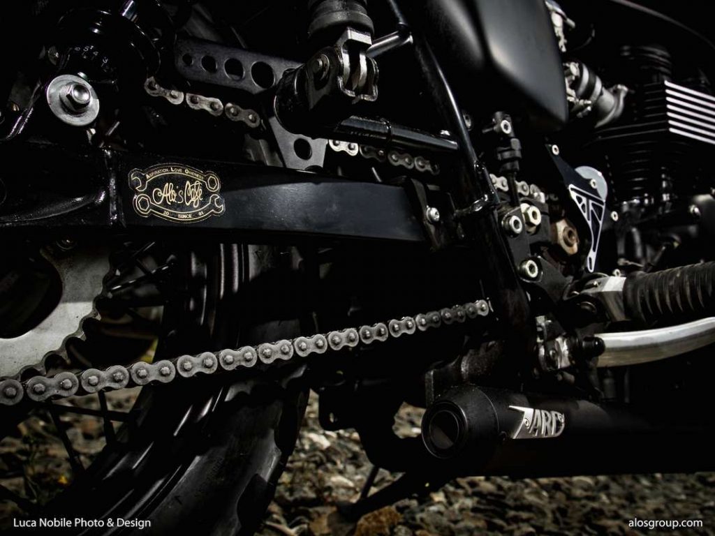 To complete the look, a custom made seat was made and covered in tan aged leather, a seat which goes very nicely with the satin black paintwork. The Bonneville Black also uses many of Alo’s groups own range of a parts including their ignition relocation bracket and sprocket covers, all of which Im told are made in Italy and are sold via their website.