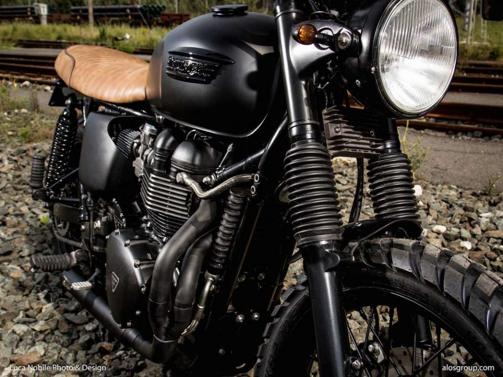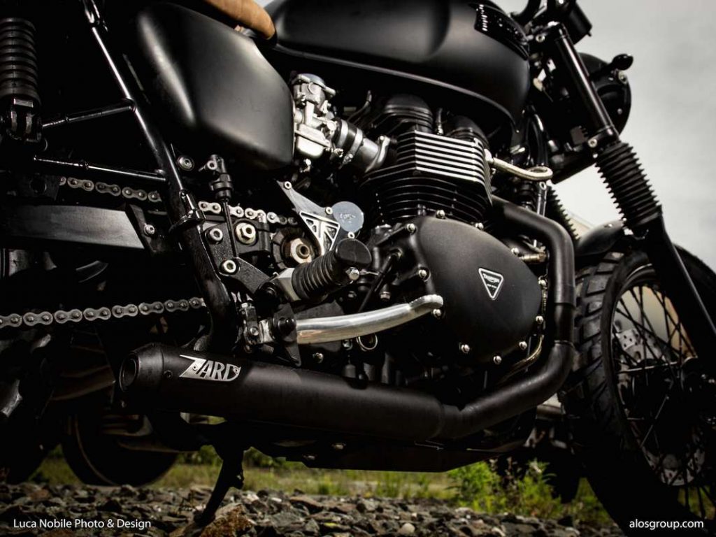 Starting with a Bonneville Black and keeping the budget down, Raffaele and Stefano Ferraro decided not to use their trademark tank, instead keeping the stock item and having it, as well as the shortened mudguards and side cover painted in satin Black — unitentianly giving the ‘Terrain‘ the ‘David Beckham’ look.