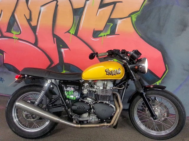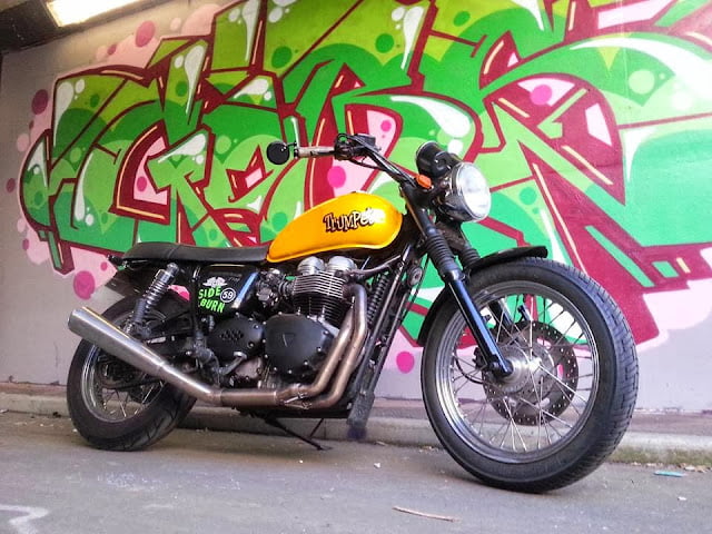Dave also powder coated the engine cases black/drilled out the sprocket cover and swapped out the 17 tooth front sprocket for a 19 tooth one, and fitted a Sunline motocross MX alloy gear shifter. Dave opted for a 2/1 stainless exhaust over the way too quiet standard peashooters and finally he stripped the tank of badges and knee rubbers, added some fresh paint (Ford Tagerine Scream) then had it signwritten locally with “TRUMPET” To finish it all off Dave has the number plate T100 FTW, perfect!