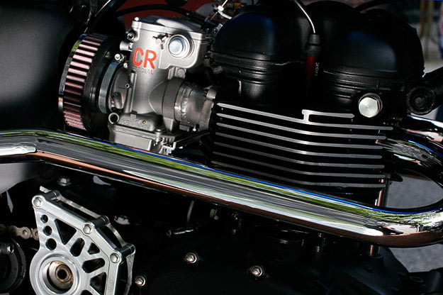 ‘The 865 cc engine internals are stock, but the removal of the oil cooler threw me at first. It’s apparently had no injurious effect: “with richer jetting and new pipes, oil temperatures have not been a problem,” says Hammarhead. “I constructed a custom Spurgin oil cooler for the bike, but while I was waiting for the lines to arrive, my brother encouraged me to throw in a few plugs and light the bike. We ran it with an oil temp gauge and slowly became more confident. For nervous folks (like me) an oil cooler is a no-cost option.”