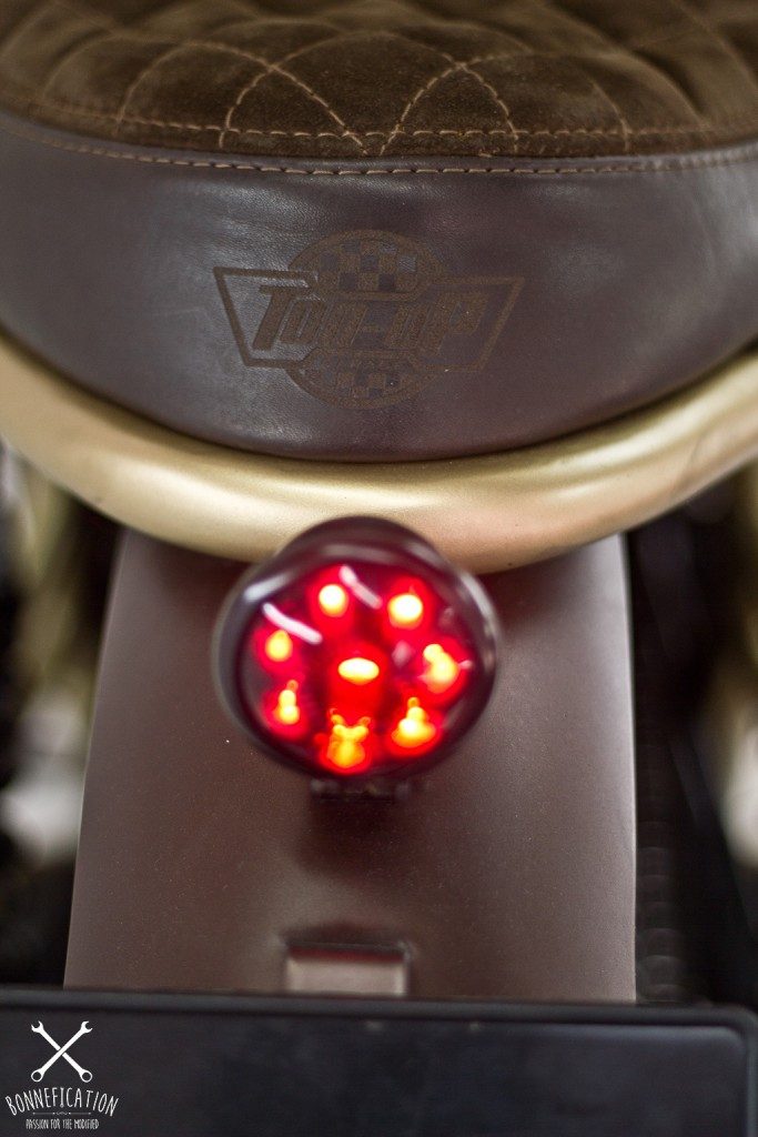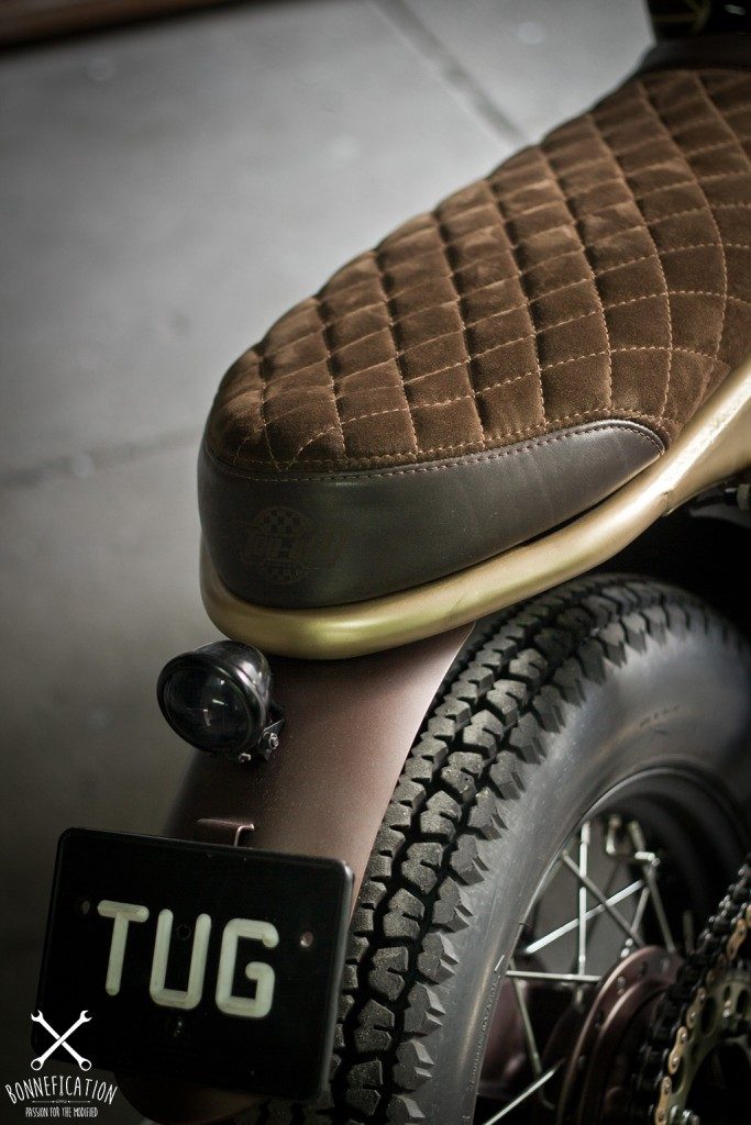 Continuing the theme is a super sexy diamond stitched seat was made by the guys at Ton-Up Garage. A seat which has been shaped to match the curvature of the frame and loop, before finally being upholstered in brown suede and leather, leather which was supplied by Portuguese shoe maker ‘Nobrand’… classy!