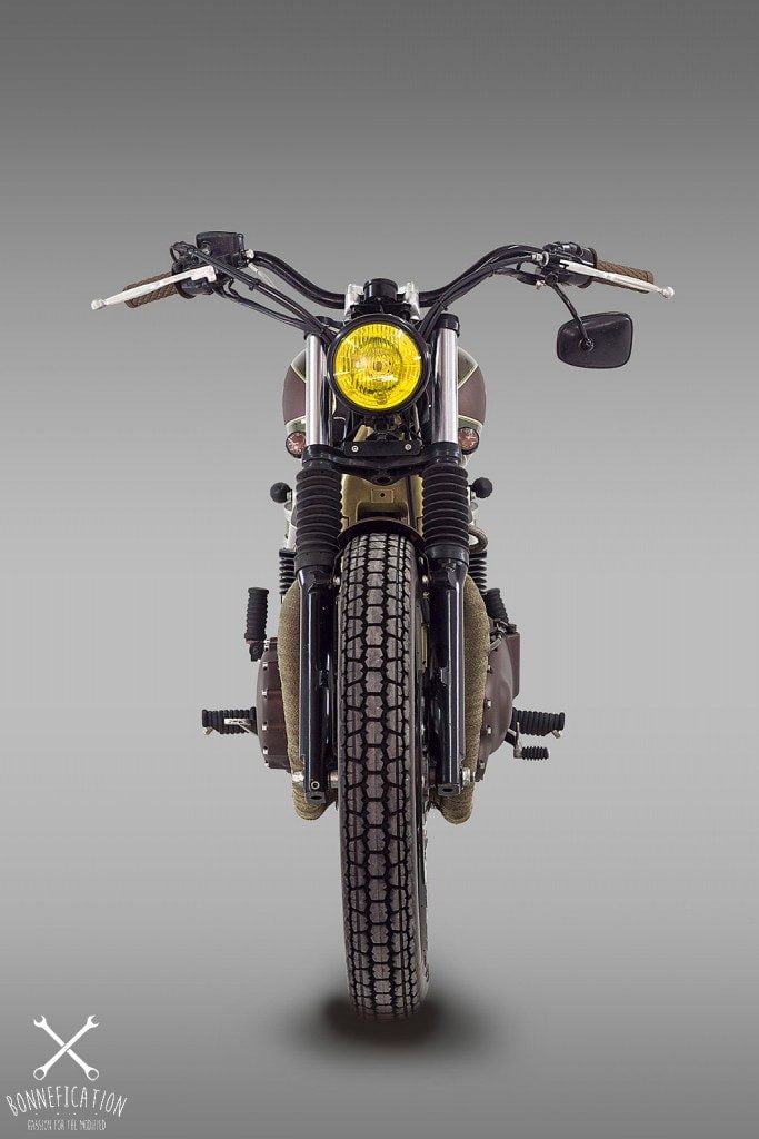 Keeping the spray at bay, painted front and rear mudguards have been fitted with the rear sporting a Bates style LED taillight. Which has been paired with a 4.5″ Bates bottom mounted headlight and Shin-Yo Arizona turn signals. These have then been relocated to the rear shock mounts and to the bottom yoke behind the front stanchions.
