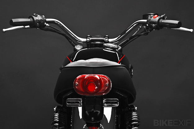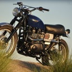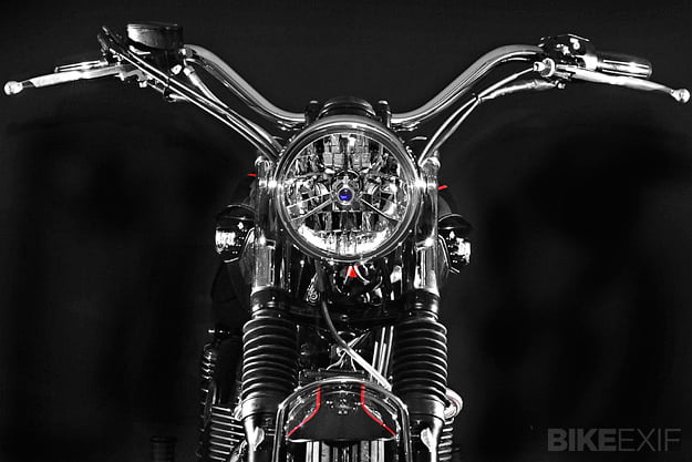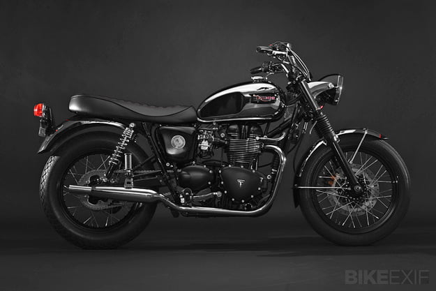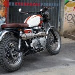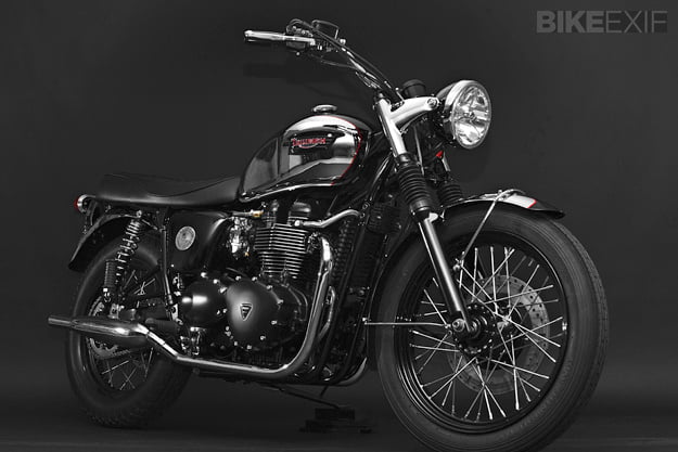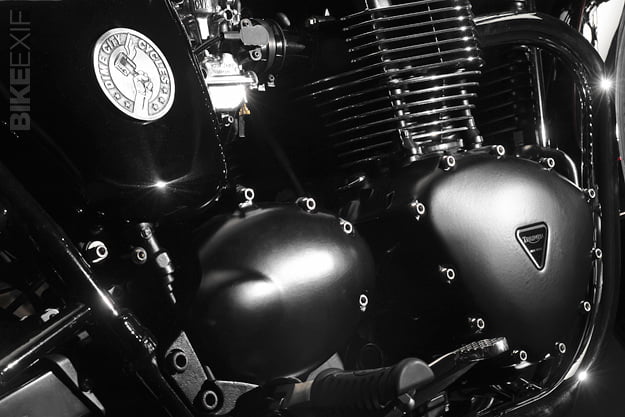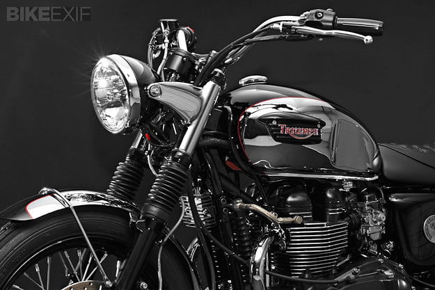 Dime City Cycles Bonneville SpecificationDCC Factory-fit Retro Square Stitch SeatDCC Classic BarsDCC Retro Headlight Bucket w/ Diamond LensDCC Fork GaitersDCC Ignition Relocation KitDCC Steering Damper KitDCC Polished Aluminum Velocity StacksDCC Factory-fit Stainless Steel Brake Line KitRe-worked OE Triumph Headlight EarsRetro Fuel CapCoker Diamond Tread Rear Laced to Excel 17″ Aluminum RimAvon Speed Master Front w/ Stock 19″ WheelD9 Low-pro Gauge Cluster w/ DCC SpeedoProgressive Suspension Performance Springs and 412 Series Rear ShocksBritish Customs Sleeper Exhaust and Airbox Removal KitReworked OE Rear Fender w/ 1960′s Honda CL TaillightBritish Customs Regulator Reloc. KitTriumph Tank BadgesTriumph Thruxton Pre-load Fork CapsPowder coating by Profab Customs, paint by Moe Colors.