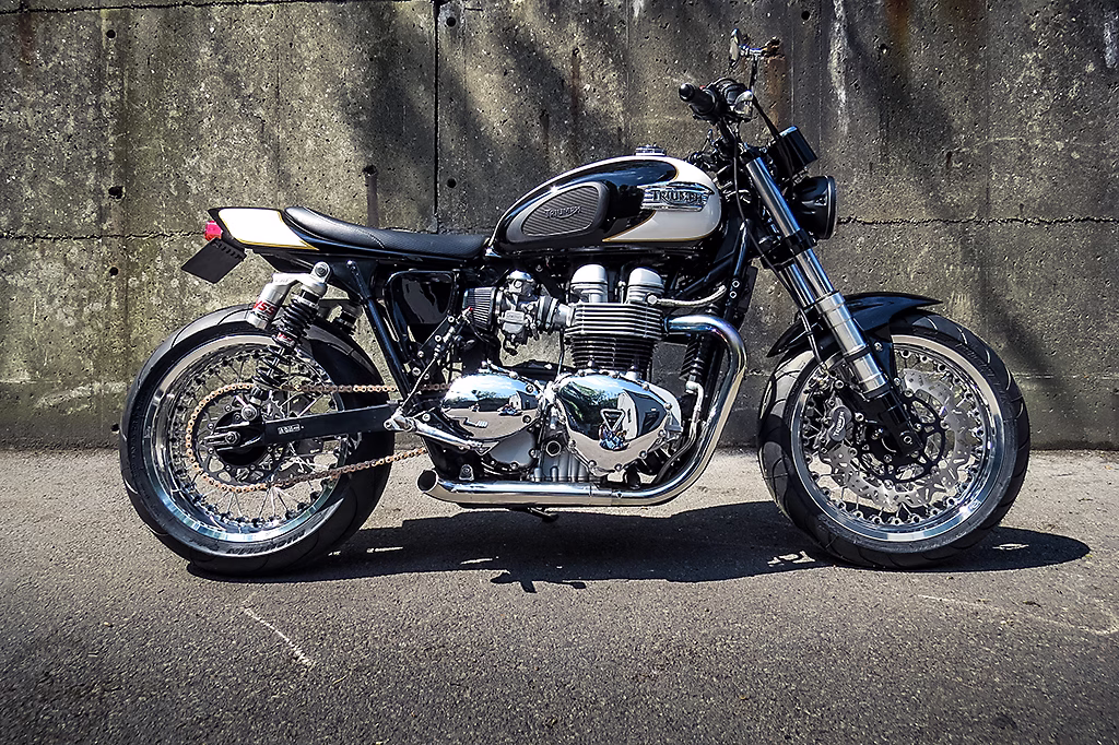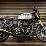 2 Wheels Miklo take on the Tracker of course features the classic Tracker seat which on this occasion is from Mule Motorcycle, the builder of many a fine Tracker. At the front are forks from a T595 Speed Triple with a Shin-Arizona bottom mounted headlight squeezed in between the yokes. The Tank is the stock unit with both tank and seat cowl being painted by Cycle Sprays of Cranleigh Surry.