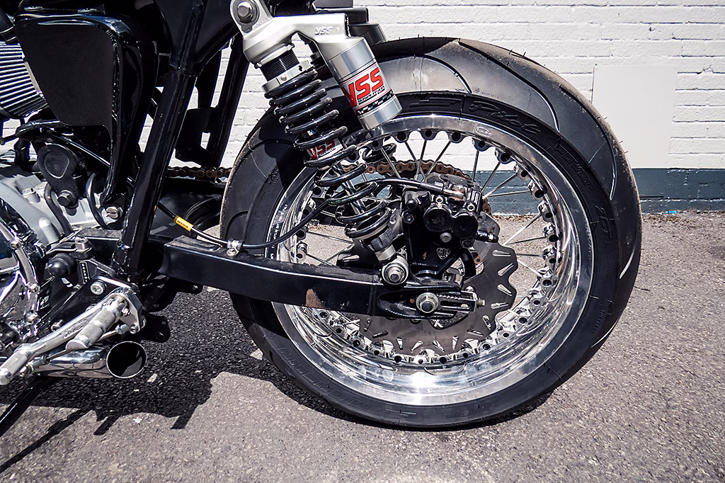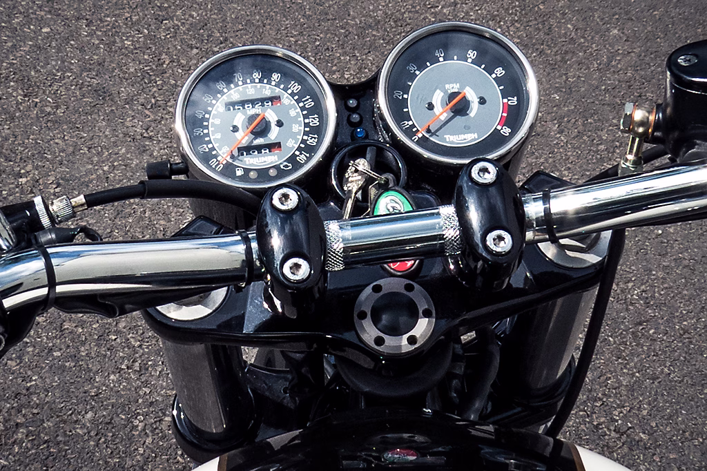 2 Wheels Miklo take on the Tracker of course features the classic Tracker seat which on this occasion is from Mule Motorcycle, the builder of many a fine Tracker. At the front are forks from a T595 Speed Triple with a Shin-Arizona bottom mounted headlight squeezed in between the yokes. The Tank is the stock unit with both tank and seat cowl being painted by Cycle Sprays of Cranleigh Surry.
