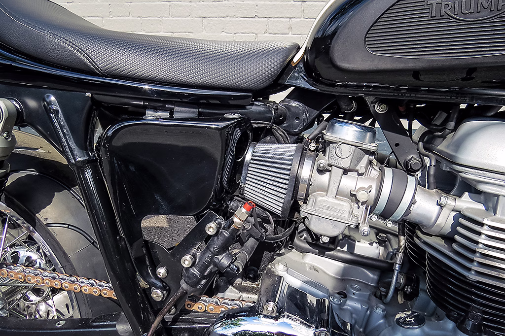 At the back are YSS piggy back shock, Norman Hyde rear sets and the a Triumph Twin Power rear calliper hanger which keeps the brake out of the muck. The stock Air/Battery box has been removed with he carbs then being fitted with conical air-filters paired with a custom hot rod exhausts. The finished bike sits on Kineo wheels which have been fitted with EBC Contour discs & Michelin Pilot Power tyres.