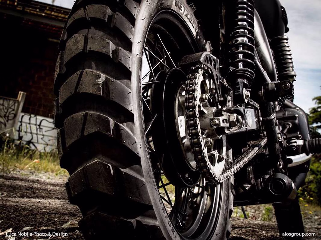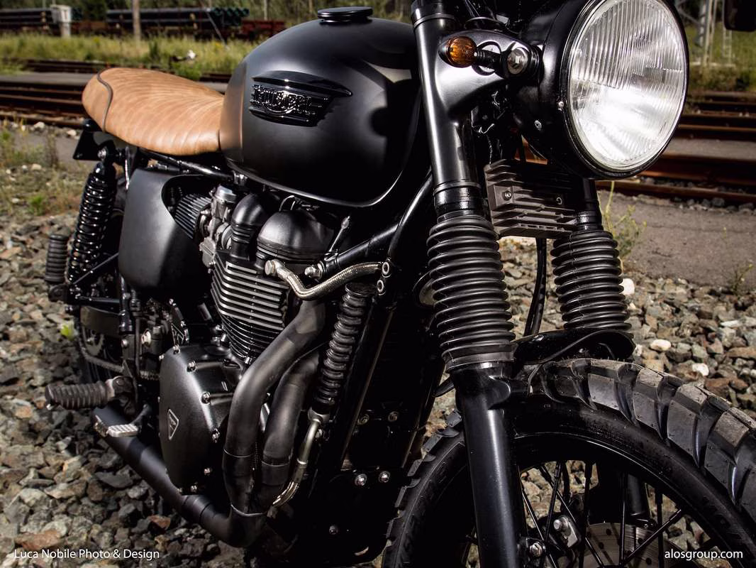 To complete the look, a custom made seat was made and covered in tan aged leather, a seat which goes very nicely with the satin black paintwork. The Bonneville Black also uses many of Alo’s groups own range of a parts including their ignition relocation bracket and sprocket covers, all of which Im told are made in Italy and are sold via their website.