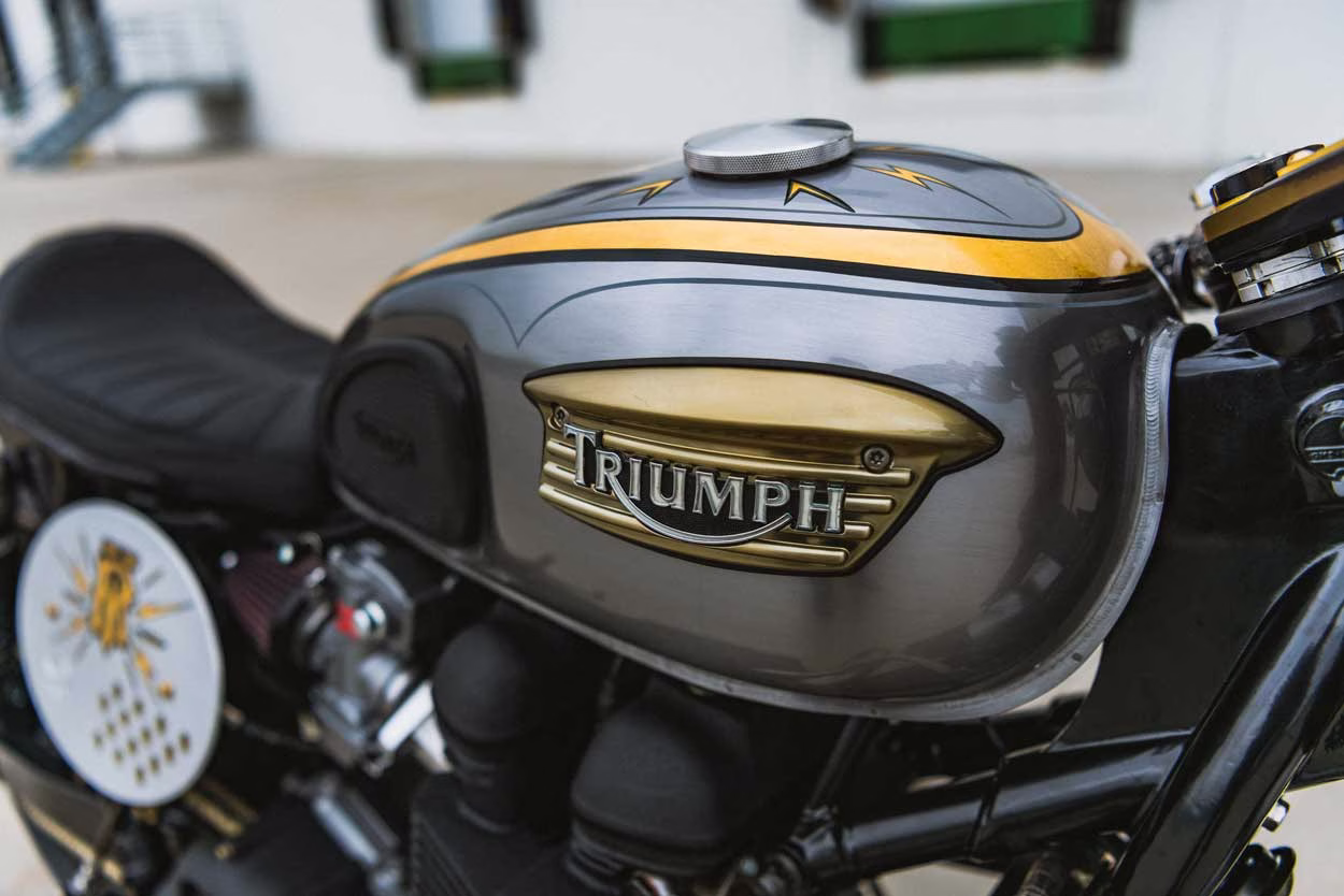 The result is the El Matador 2, based on an earlier Triumph build, the ‘El Matador’, which is a very pretty 1972 650cc Bonneville Bobber, finished in brass and clear coated metal. Not wanting to build a carbon copy of the El Matador, Tony decided to rework it Cafe Racer style, and using the more up to date Hinckley Twin.