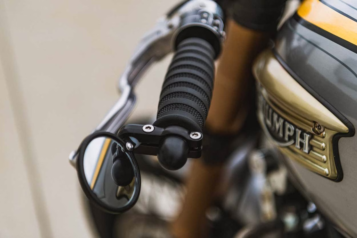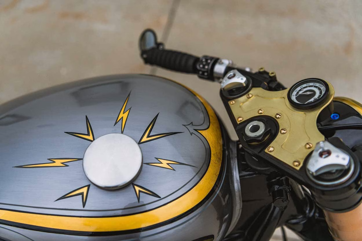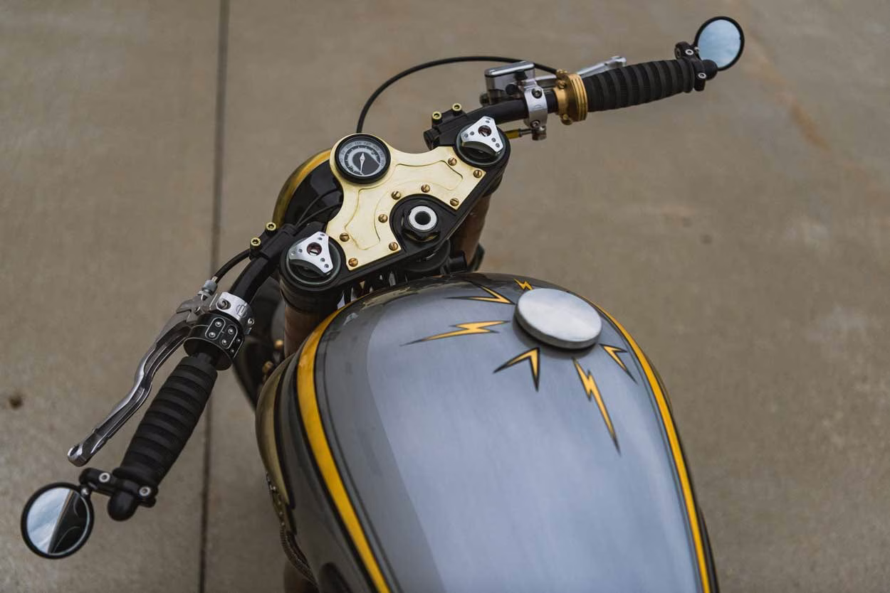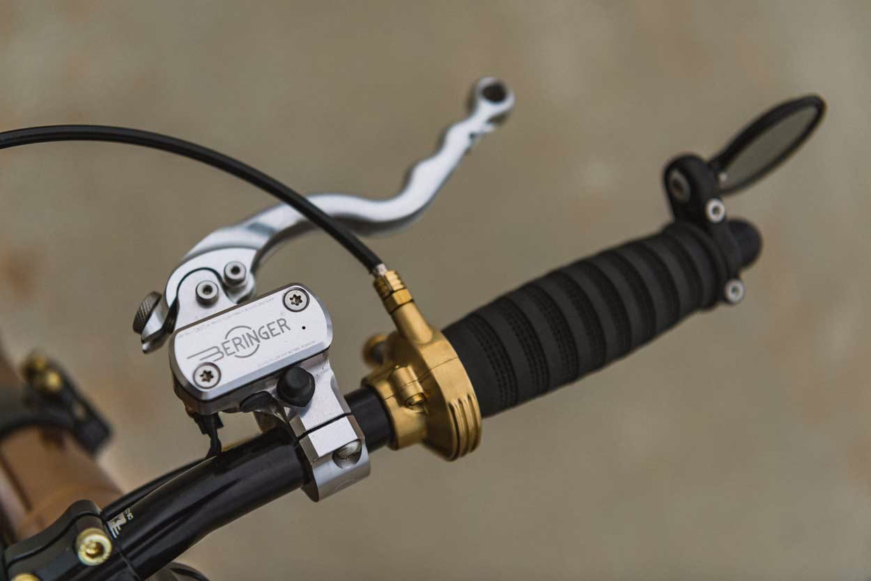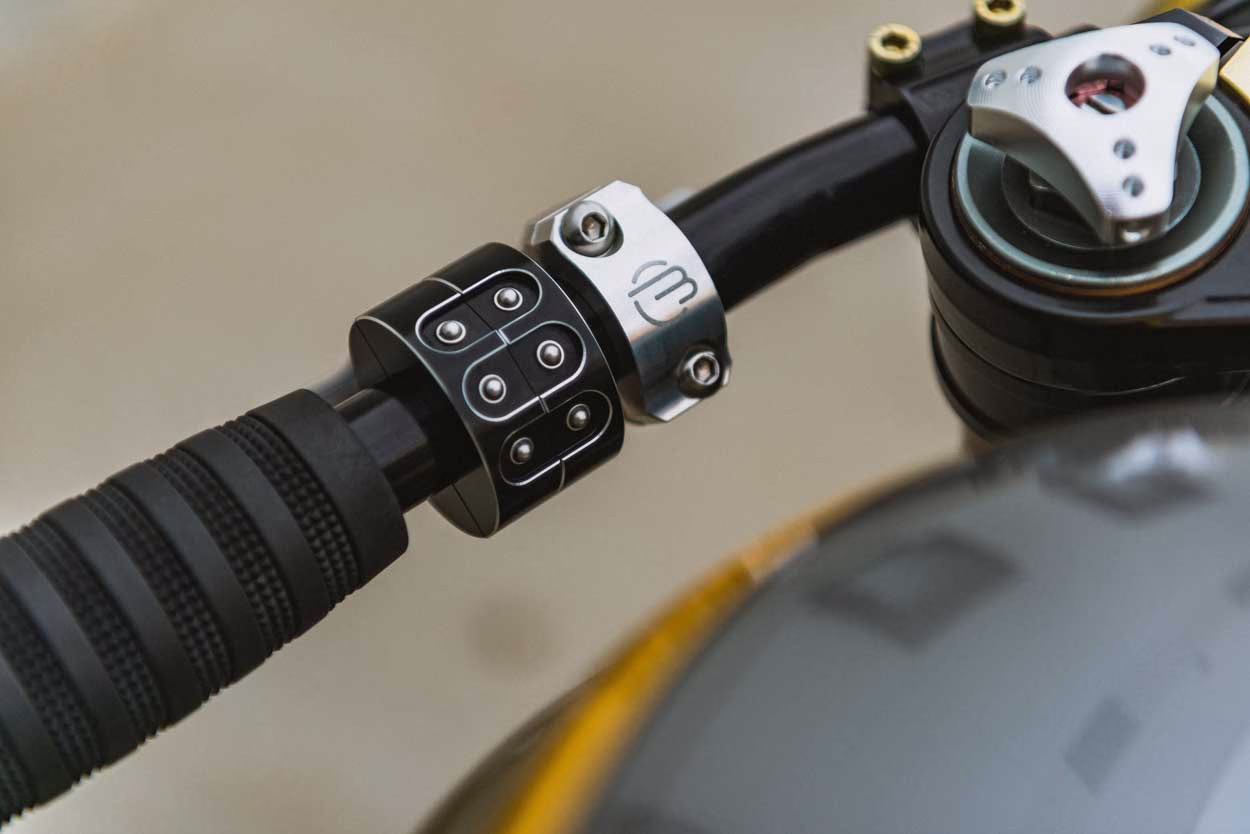 The bars are the Speedy Moto Omini clip-ons, fitted with CRG bar end mirrors and two Motogadget m-Switch minis sitting side by side, and connected to the Motogadget the m-Unit. The knurled black rubber grips, Brass engine tag, and Kustom Tech brass throttle assembly are all from Low Brow Customs.