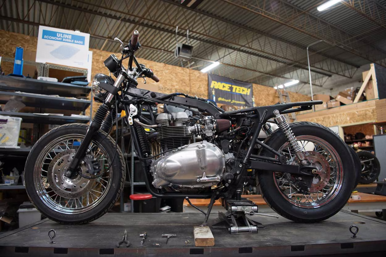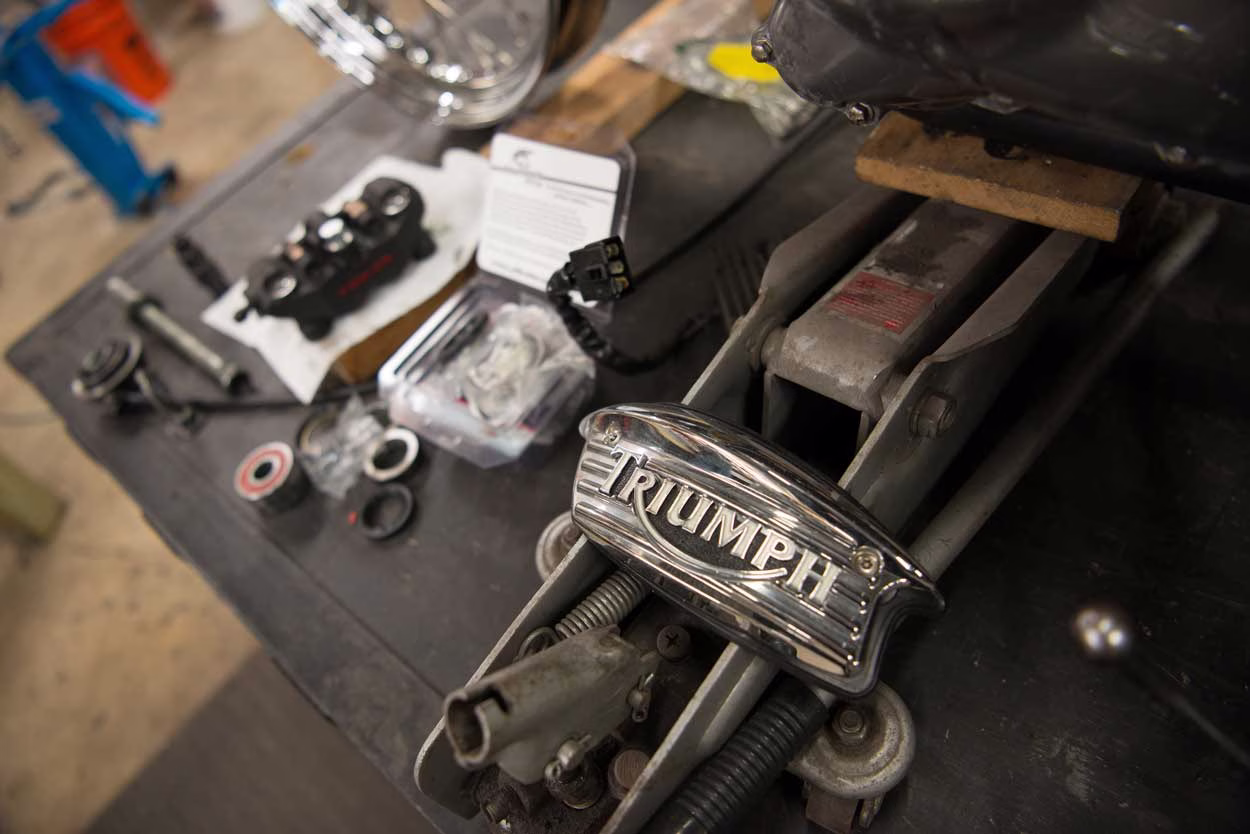 The front 4-pot calliper from the GSX-R was re-fitted and paired with a set of Beringer levers. With the front end getting so much attention the Triumph needed a rear end stance change, achieved by fitting a set of custom Race Tech G3-S shocks.