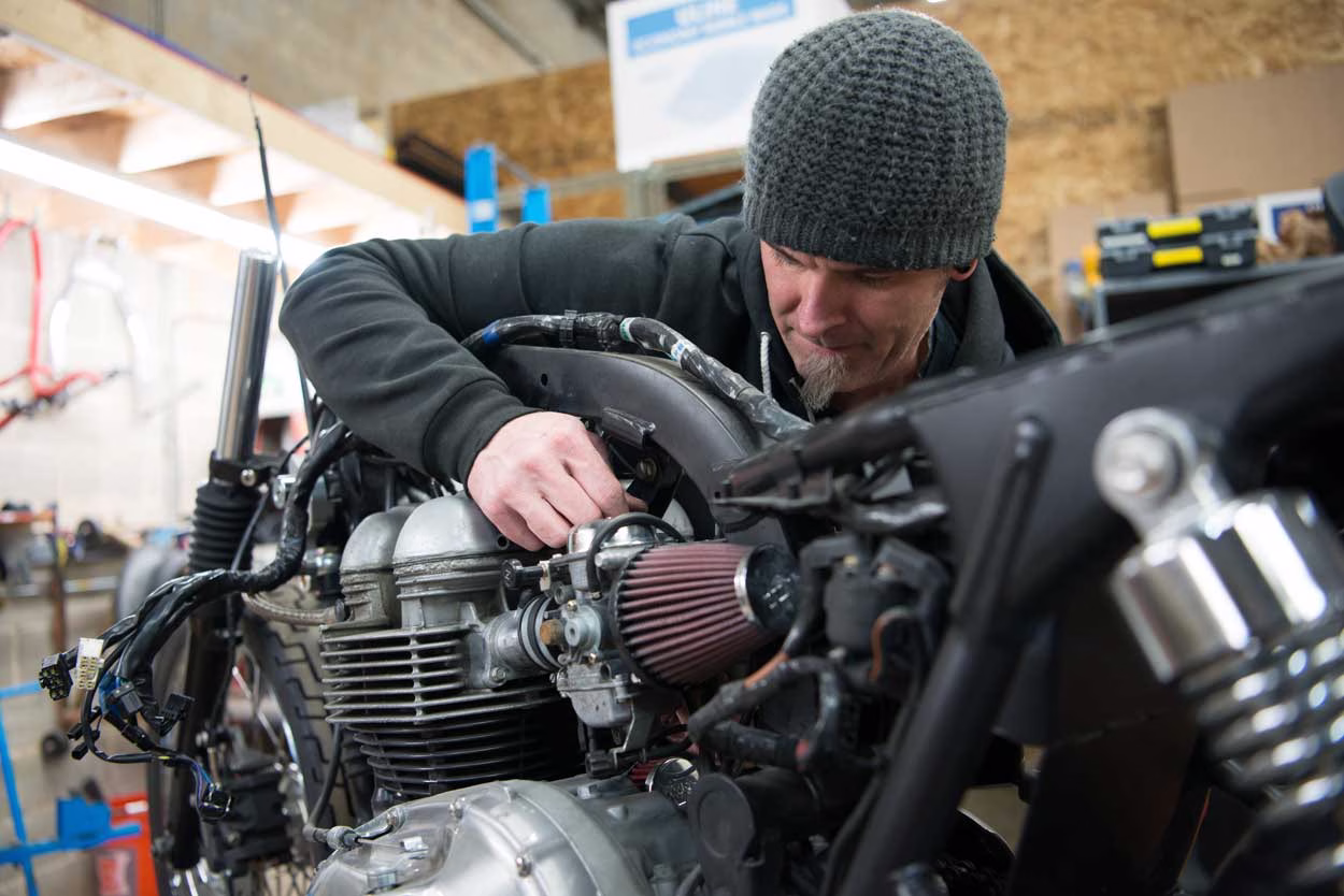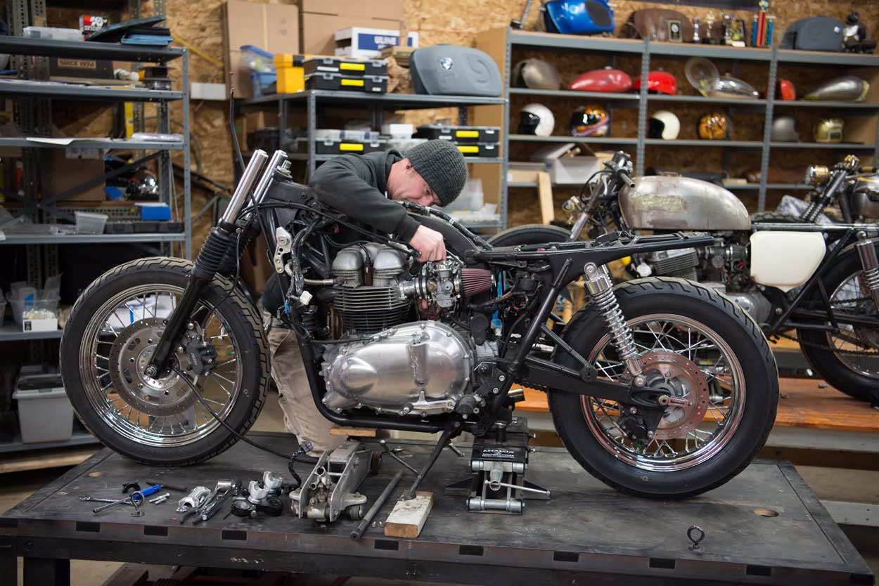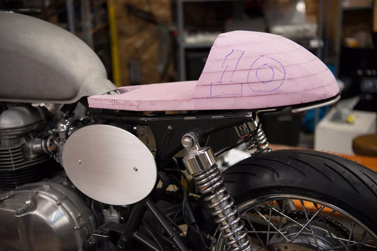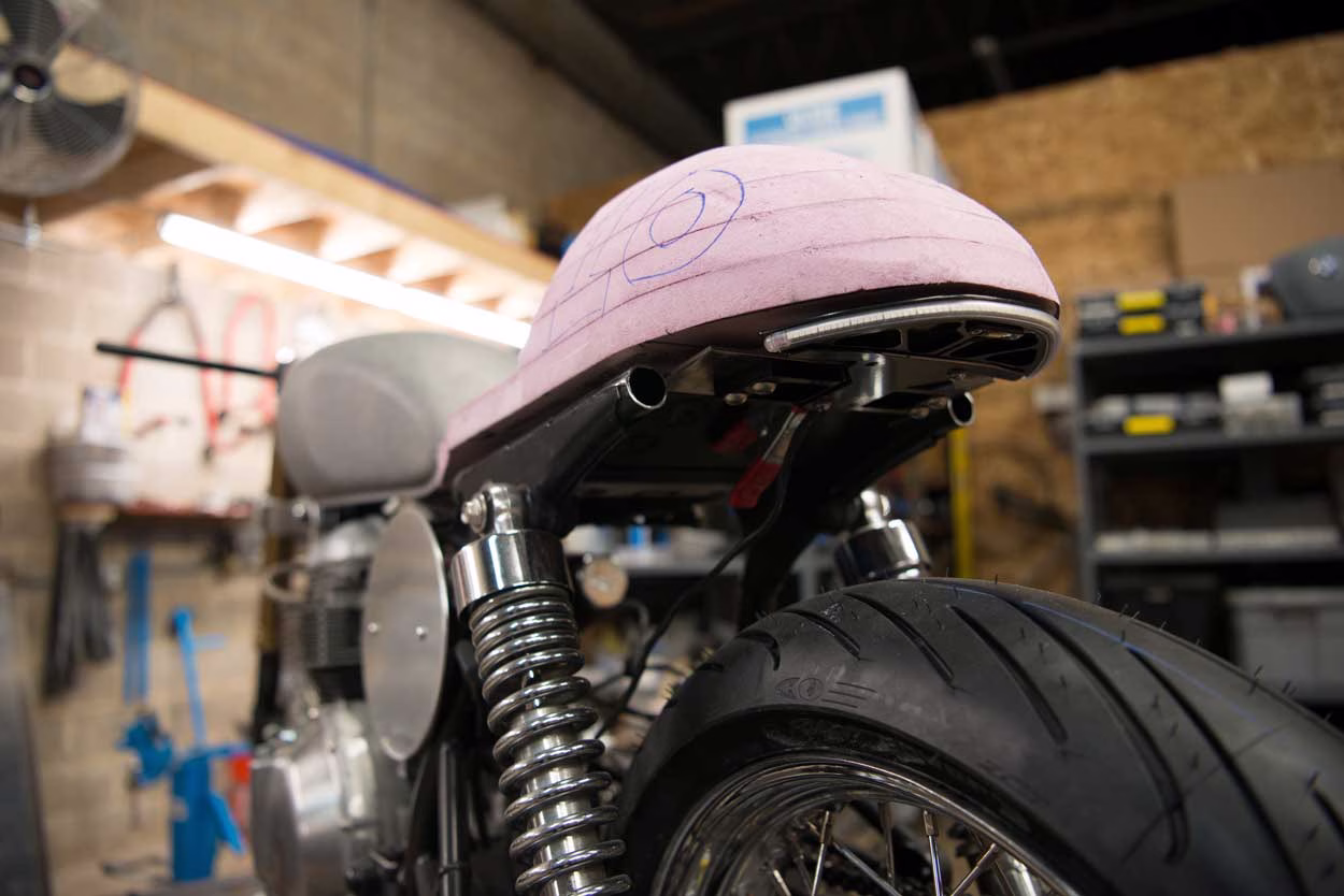 The old seat was ditched and a new cowl was sculpted in foam, before being hand crafted in steel, in which can be kept a few tools, gloves or perhaps even a bottle of Rebel Yell Bourbon, all accessed by a hatch fabricated in brass — this was then upholstered by Dave Purney.