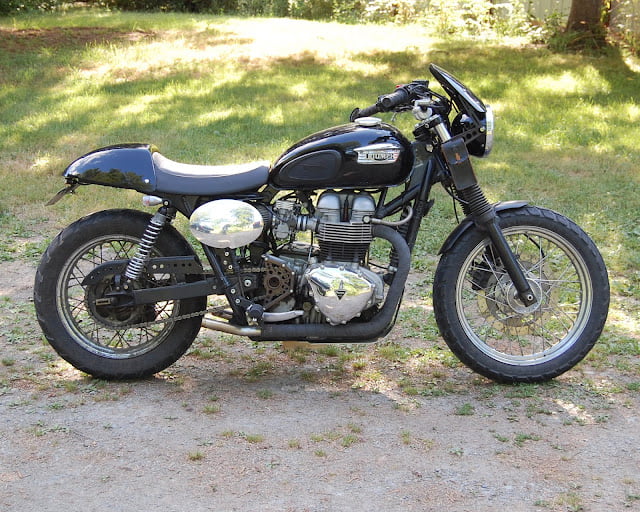 Here are some pics of my 2006 T100. I picked this off on Ebay last summer from a very cool guy who turned out to be Kyle at Lowbrow Customs. The bike had a bunch of mods when I got it… had more of a on / off road scrambler vibe. I have since added other bits to suit my style and needs — Cowl, Blinkers, Flanders Handlebars, Mini Speedo w/ D9 bracket, Joker Bar End Mirror, Knee Pads, Dart Screen, and chopped MAS Fender. Have some M Bars are on their way.