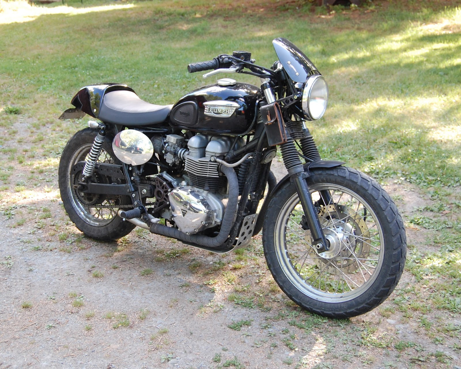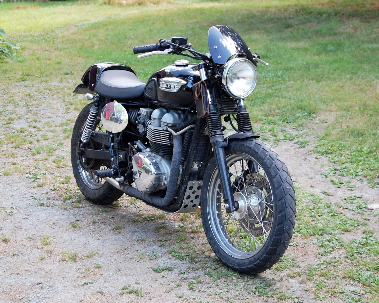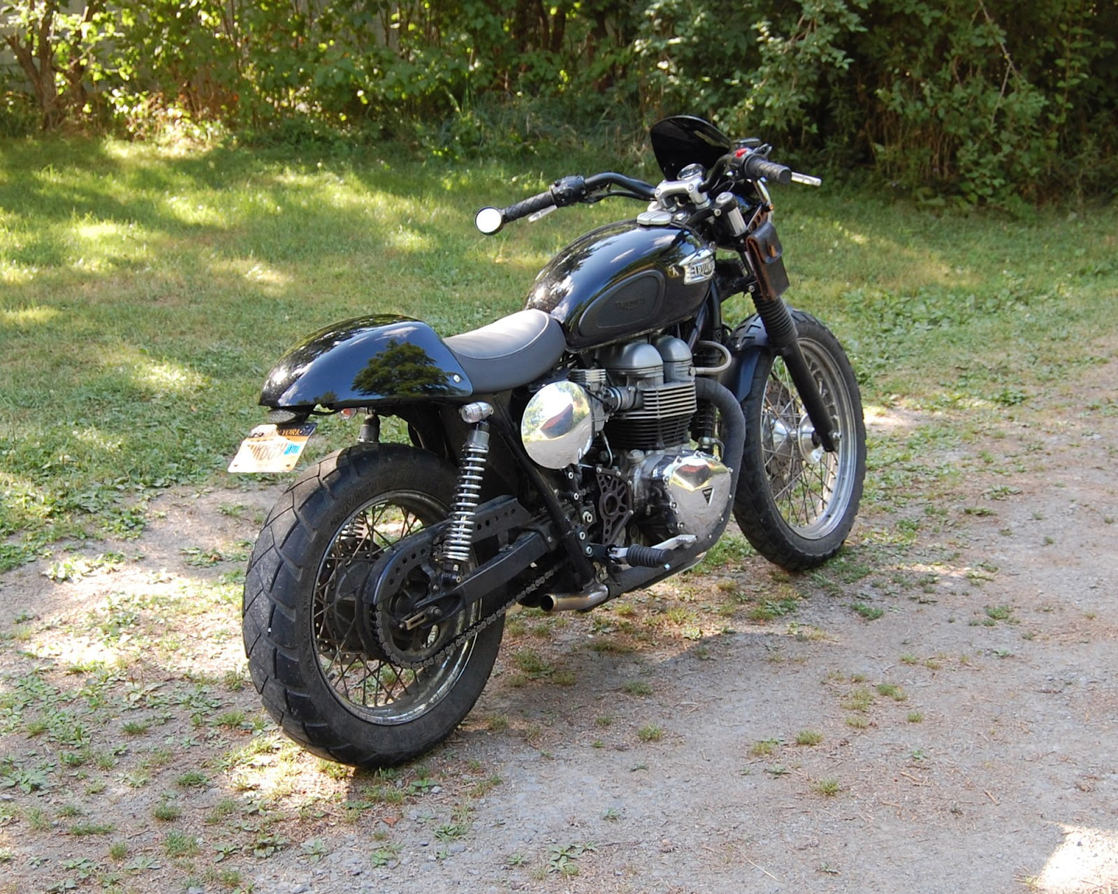 Here are some pics of my 2006 T100. I picked this off on Ebay last summer from a very cool guy who turned out to be Kyle at Lowbrow Customs. The bike had a bunch of mods when I got it… had more of a on / off road scrambler vibe. I have since added other bits to suit my style and needs — Cowl, Blinkers, Flanders Handlebars, Mini Speedo w/ D9 bracket, Joker Bar End Mirror, Knee Pads, Dart Screen, and chopped MAS Fender. Have some M Bars are on their way.