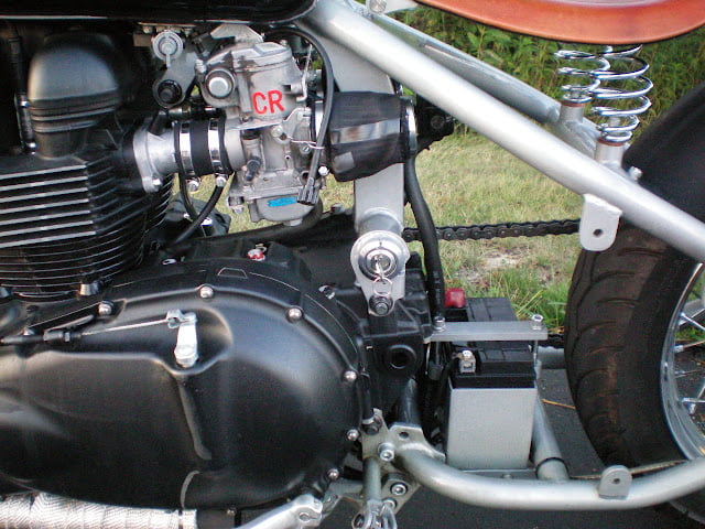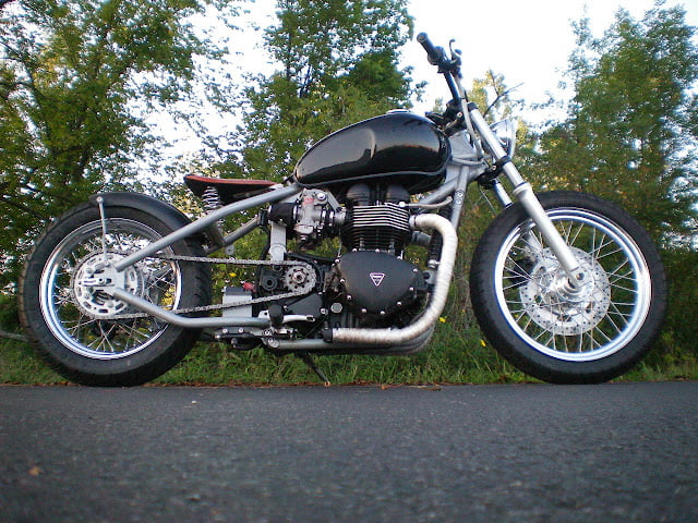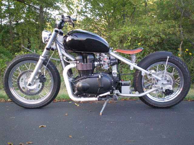 …Saw your blog and included some pics of my bonneville i put together last winter. Got the bike totaled out pretty cheap. Bought a weld-on hardtail from lowbrow customs, and much more and this is how it came out. Hope you like it….