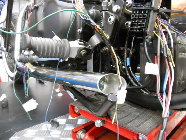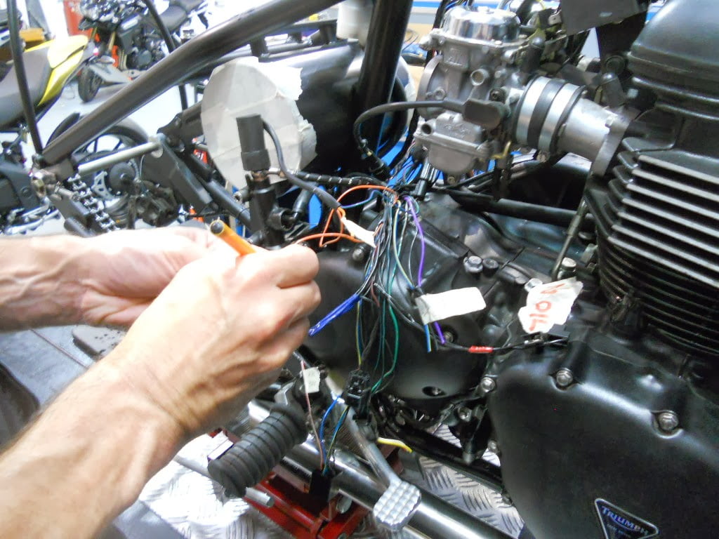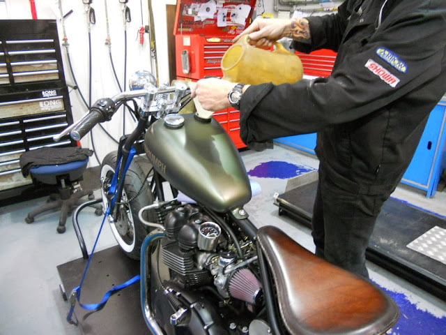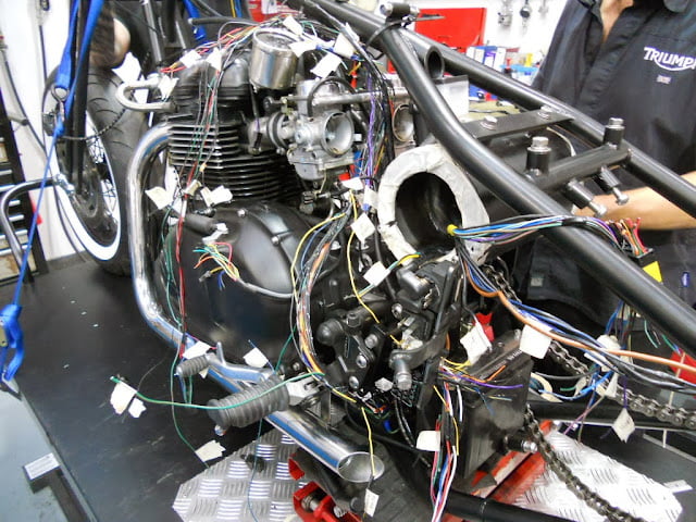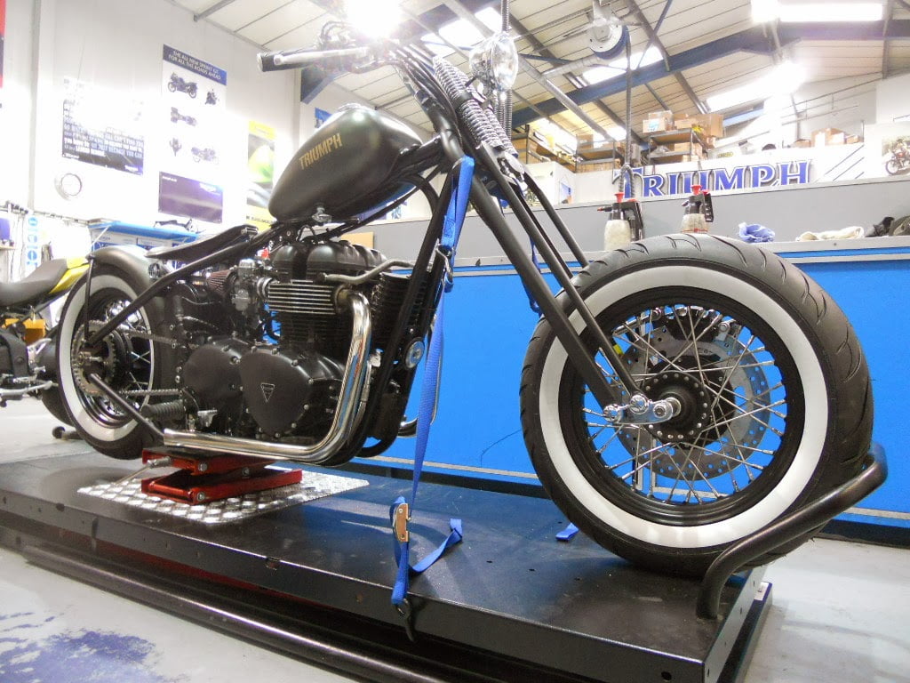 The guys at Jack Lilley wanted to create something a little different. and they succeeded. They started their project by obtaining a 2005 Bonneville with just 500 miles on the clock. The donor Bonne was stripped down and re-imagined around a frame commissioned from Fenland Choppers. To keep as much of the donor Bonne as possible, the original hubs were kept and re-laced to 16” inch Harley rims. The original Discs & callipers were also re used. Triumph Speedmaster bars replaced the stock Bonneville items, using Triumph OEM parts meant the original switchgear could also be retained.