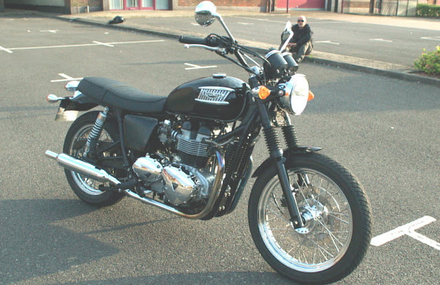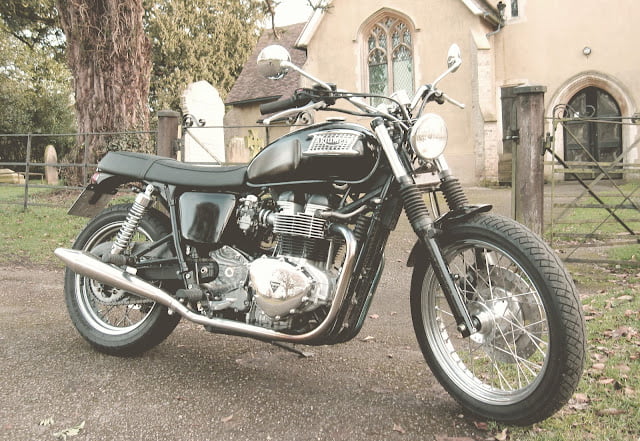 After falling in love with my Dad’s Bonneville, I picked up a 2003 T100 from a nice chap who hadn’t covered many miles since new. It was great as it was, stock apart from TOR exhausts, but I wanted to simplify the look a little and put my own touch to it. My dad and I cut the front and rear mudguards down in our garage and had them re-sprayed along with the tank — all in black, and I replaced the stock badges with the older style mouth organ type. Wider black bars required longer cables and I added fork gaiters. That was as much as I could afford for a while.