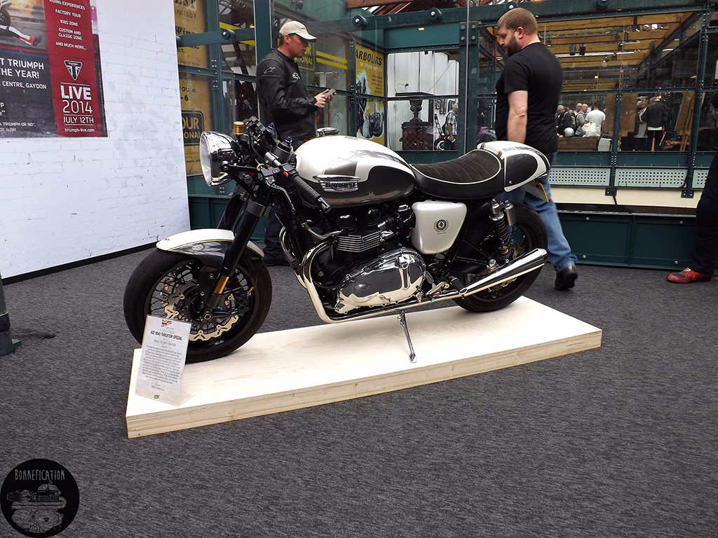 Next to the SOTS build was the Auto Fabrica Type 5 Scrambler. The attention to details from the Essex based builder was excellent. This is a machine I also hope to feature on the website shortly. It was really nice to see this particular Triumph in the metal. Not something I get to do on many bikes featured on the website, but something I hope to do more of in the future. Bonnefication ad sells permitting (hint) . Seeing the Type 5 up close allowed me to see fully the excellent build quality and the attention to details that has gone into this build. Something that is lost when you just look at those glossy studio shots we normally see. Personally I would like to see more Triumph Twins from the Auto Fabrica workshop, if this build is anything to go by. Overall a great show and well worth a visit, the show is open today until 6pm so if you are in the area you pay it a visit. See you at Triumph Live 2014.