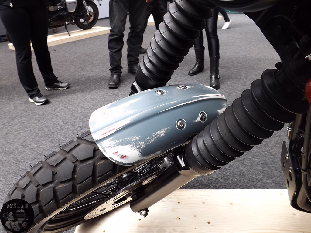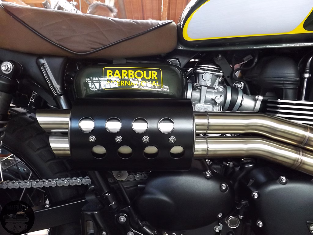 The Barbour build aka A225 Scrambler looked amazing on its plinth, which made it the centre of attention in the crowded room, excluding the bar and the stand displaying the Bell Bullitt Helmets. The main feature of the Barbour build, that any self respecting Triumph Twin enthusiast would be most interested in is that SOTS exhaust. Now that is one good looking pipe!, more on that later.