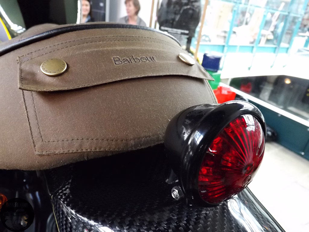 Entering the show I was met by a nicely put together 06 Bonneville ‘Shed Build’ called ‘Gulf’ish’ which sat just outside a room which housed builds by Jack Lilley, and Ace Cafe as well as a couple of stock donor bikes waiting to be purchased and modified by some lucky owner. I had seen the Jack Lilley Bobber before, so I focused on the other two Jack Lilley Triumph’s on display, both of which I would like to feature on the website at a later date. From the window of the room housing the Jack Lilley machines, I caught a glimpse of the Spirit of the Seventies Barbour build, wasting no time I rushed over to take a look only stopping to say hi to Steve Hilary of Redmax Speed Shop.