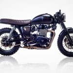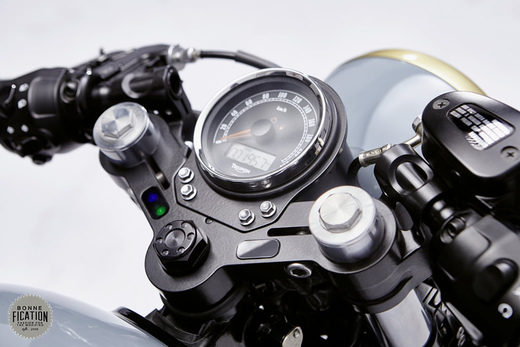 To give the T100 a much lower profile, the front headlight has been lowered and recessed using a shorter mounting brackets. The OEM bars have been swopped for a set of LSL Clip On’s and fitted with the stock switches, Beston style grips all topped off with a set of Joker Machine folding Bar end Mirrors.