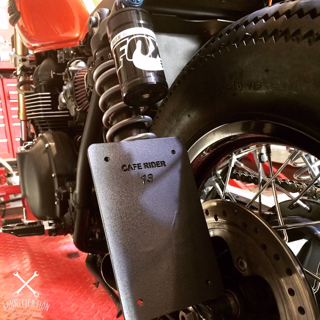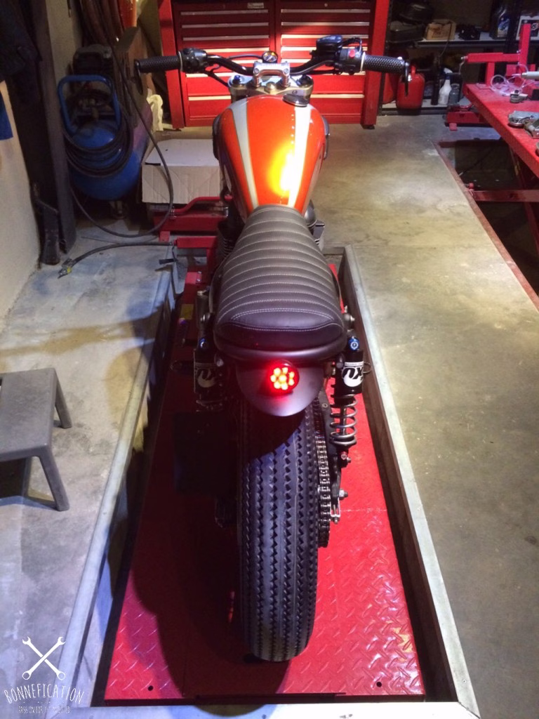 The guys set to work on the bike cutting the back end, removing the peg mount sand adding a frame loop. A custom mudguards which feature the popular Bates style LED taillight was added along with a new custom seat which was covered in black leather with white stitching.