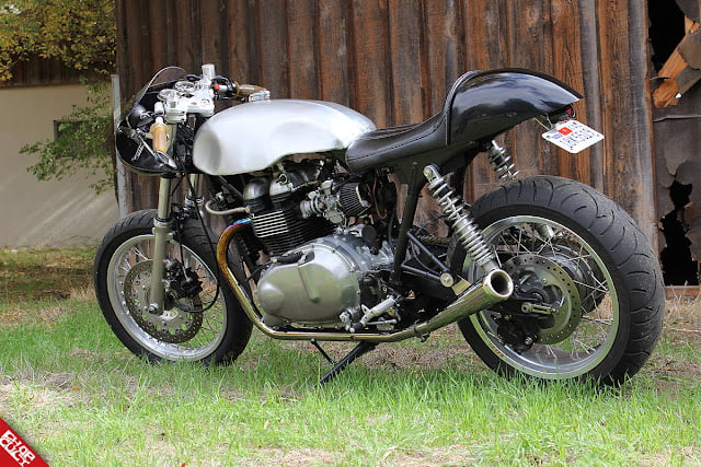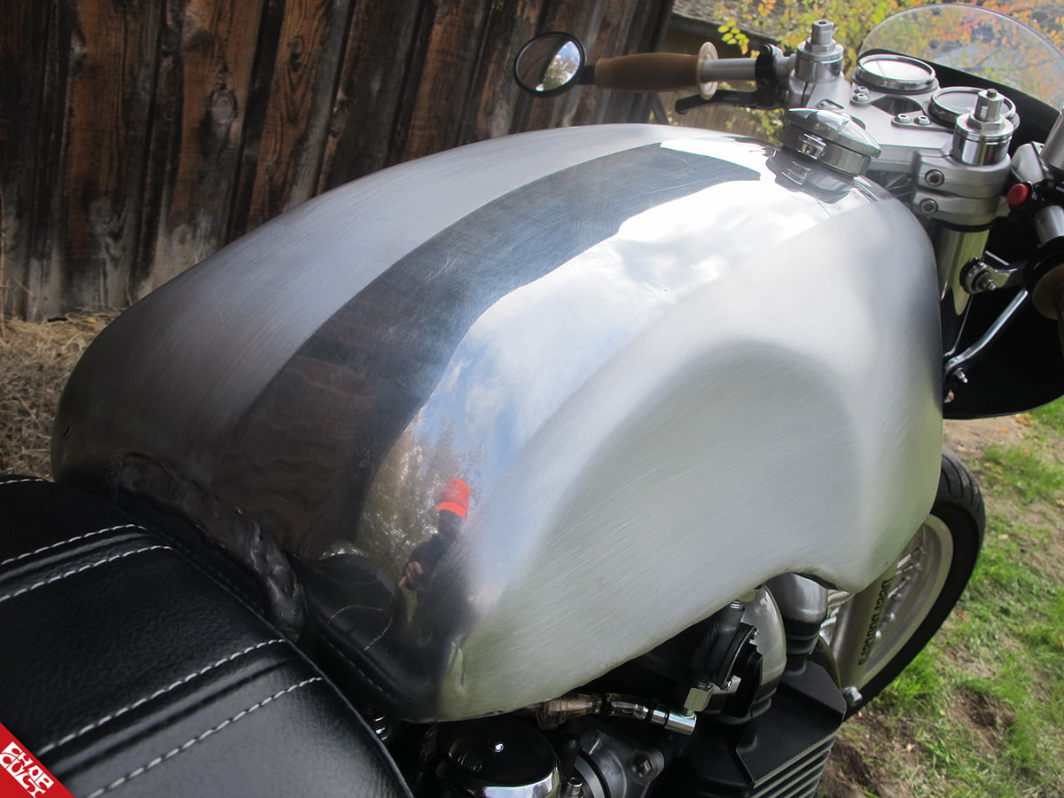 Other mods, accessories, cool parts, etc: Custom Tank from Richard Phelps at TabII classics, Aftermarket Thruxton Glass bubble seat that was cut, shaved and hacked from Airtech, The upholstery was done by my local secret guy that I brought a picture to of the most ghey looking Italian shoes that I could find and had him copy it; other than that — All kinds of stuff!