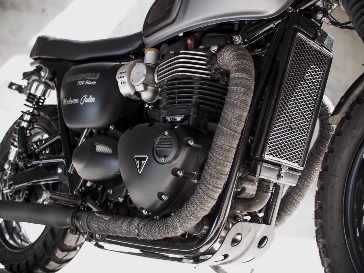 Finishing details on this build include; a sump guard from Triumph’s official line up of aftermarket accessories, a stock and drilled chain guard, and slick ‘Madame Julie’ graphics on each side cover.