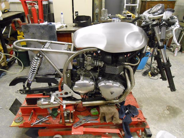 Hi there , just dropping you some shots of my new build. My take on a Hinckley triton . I sent you some photos of a full frame we made to take the new hinckley engine a wile back now . this is my ride for this year , im about two weeks into the build now and its just about there , waiting for the wheels coming back and .its going for some paint , I did this bike so it still as all the triumph frame numbers still there so no swapping numbers about , me and my brother made all the new frame rails in the manxs style , 1st was to cut off the rear end and make a new full sub frame and mount the tank rails , then we cut out the box back bone so we add room for the alloy sprint tank ,a alloy dummy oil tank was made to take the battery ,and a set of ace bars I made out of stainless steel , alloy rear set hangers , the best bit about this build is that the bike will still ride like the original triumph did , me and my brother also build full frames to take these engines , this will be a six week build start to finish , all work by me at home.