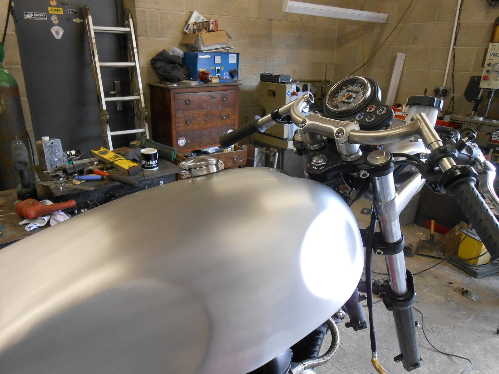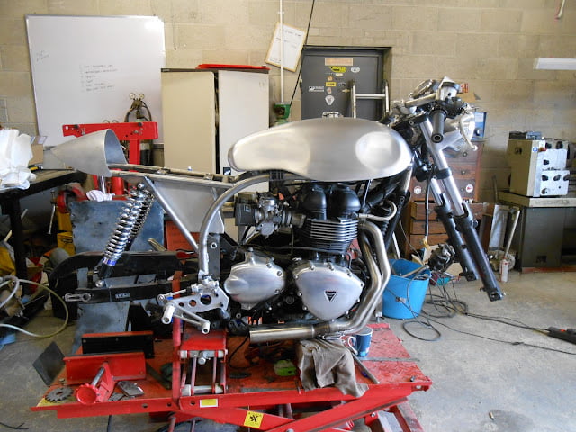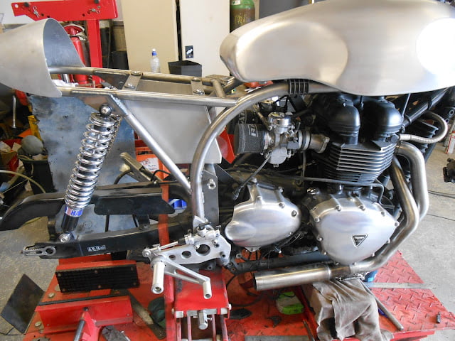 Hi there , just dropping you some shots of my new build. My take on a Hinckley triton . I sent you some photos of a full frame we made to take the new hinckley engine a wile back now . this is my ride for this year , im about two weeks into the build now and its just about there , waiting for the wheels coming back and .its going for some paint , I did this bike so it still as all the triumph frame numbers still there so no swapping numbers about , me and my brother made all the new frame rails in the manxs style , 1st was to cut off the rear end and make a new full sub frame and mount the tank rails , then we cut out the box back bone so we add room for the alloy sprint tank ,a alloy dummy oil tank was made to take the battery ,and a set of ace bars I made out of stainless steel , alloy rear set hangers , the best bit about this build is that the bike will still ride like the original triumph did , me and my brother also build full frames to take these engines , this will be a six week build start to finish , all work by me at home.