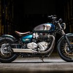 The front end also received a custom made headlight number-board setup, mini LED signals and sensibly a full length aluminium mudguard. Up top are generic 7/8” braced MX bars, vintage grips and an XS650 style mini speedo wired into this late model Bonneville via a Motogadget m.tri adapter.