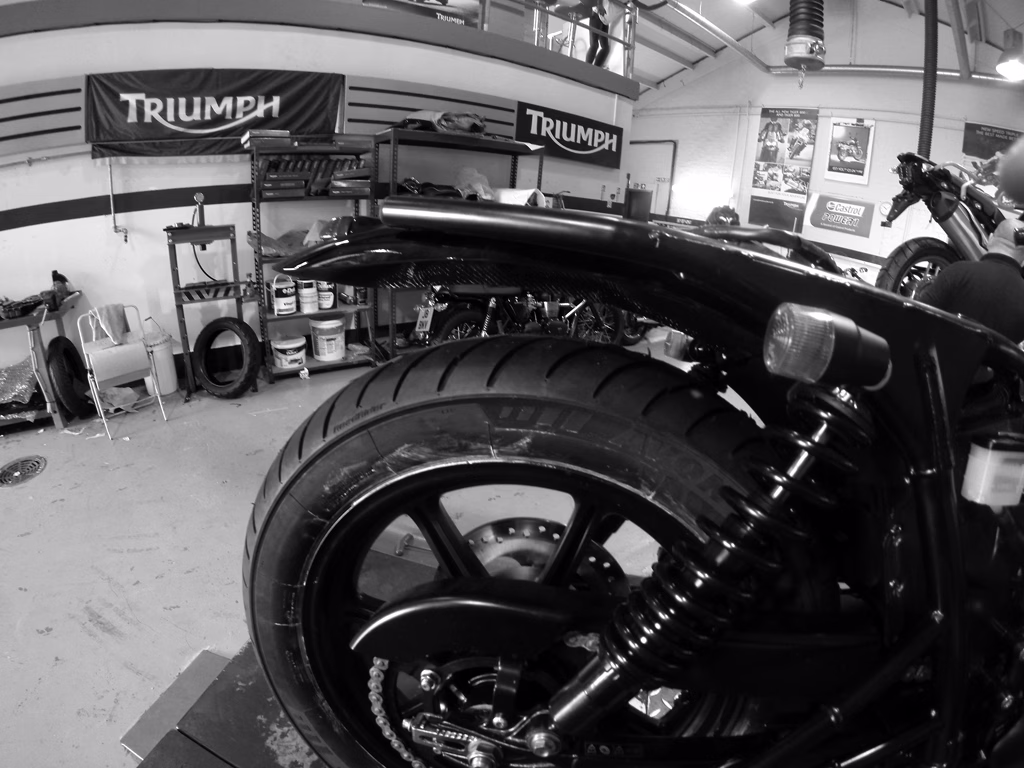 At the back, is the super cool LSL Extreme mudguard, which I think is one of the best looking off-the-shelf mudguards on the market. The front is the original item, which has just been cut down. The dark brown leather seat is from the U.S Company, British Customs, who stock a vast range of parts for the Triumph twin. The Zard exhaust system has been ceramic coated, off-white with end and grills ceramic coated in a titanium colour.