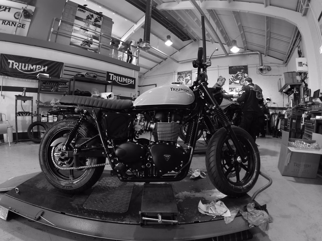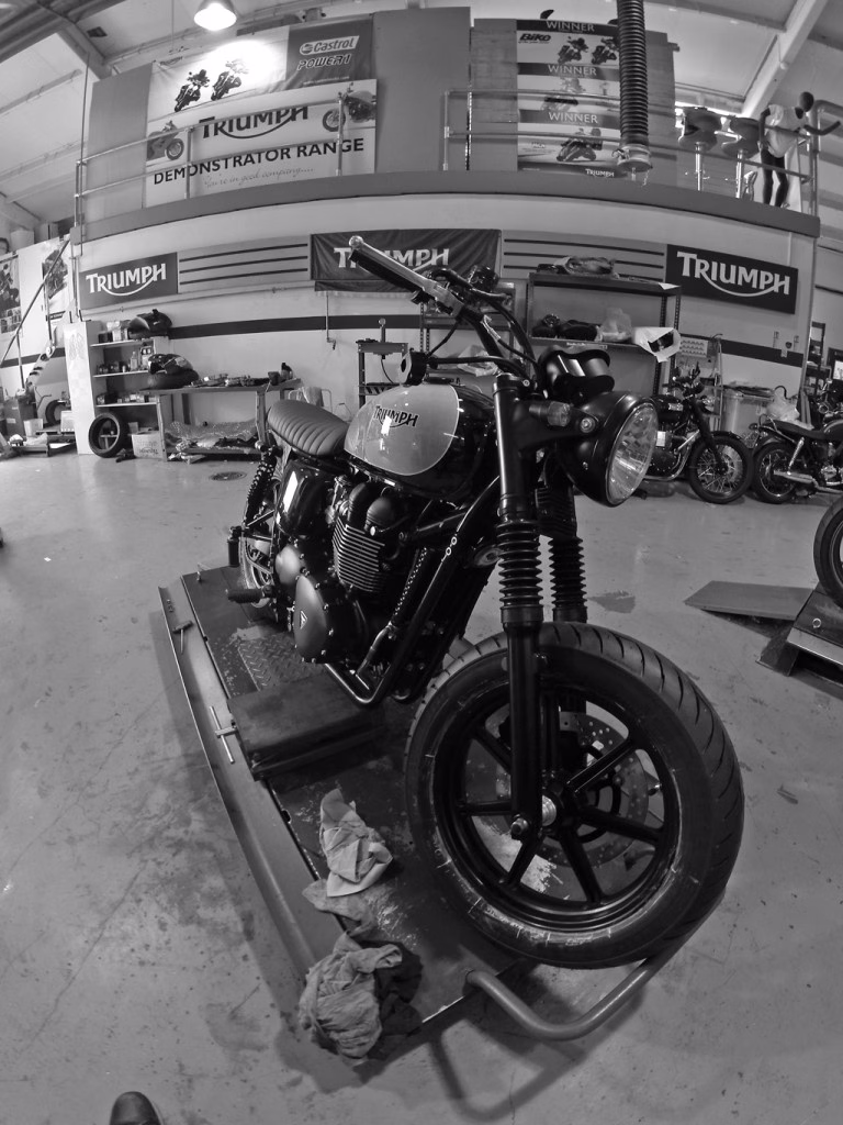 Then the guys in the Jack Lilley workshop had the wheels powder coated black, along with the headlight rim, gear and rear brake levers. The bike also received a new top-yoke and clocks from a Bonneville. While in the Triumph parts bin, the Scrambler had its old engine casing and front brake reservoir replaced, with the stock bars being changed for those from a Street Triple, and finished off with a nice new black Triumph Bash Plate.