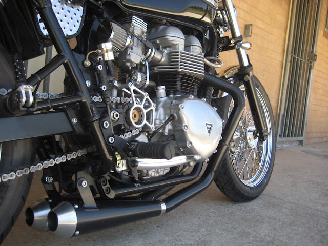 2003 Triumph Bonneville First off you will notice the crazy exhaust, thruxton seat, integrated bracket to hold headlight and front blinkers, lowered 1inch at front, custom chrome fibreglass front mini fender one off, mini speedo and of course super cool battery box.
