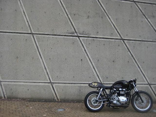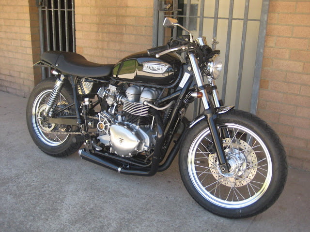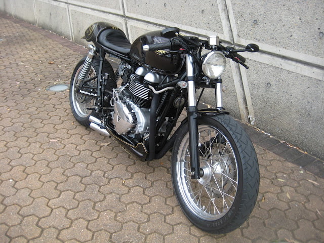 This one is FOR SALE……(see website for details) Sticky 180 tyres on the back makes this thing a beast around corners, along with “special” tyre warmers the exhaust, with an agressive stance this is not for the faint hearted. 2008 Triumph Bonneville T100 . with 3000kms on the clock — this bike has been in work shop for over 6 months, Most parts on bike are one off, or has been customised in some way -You will notice that it has a one off rim on the rear to accommodate the 180 size tires along with custom uprated shocks,custom made short brake/clutch levers, custom foot pegs, custom paint, custom front fender, bates head light, alloy blinkers, custom one off clipons and top bridge to match, custom speedo, tank has been customised to fit, one off fibreglass seat/belly pan, one off exhaust system, odyssey battery, whole bike rewired, air breather/filter dyno tuned and calibrated. A whole lot more has been done you really need to see this for yourself to appreciate.