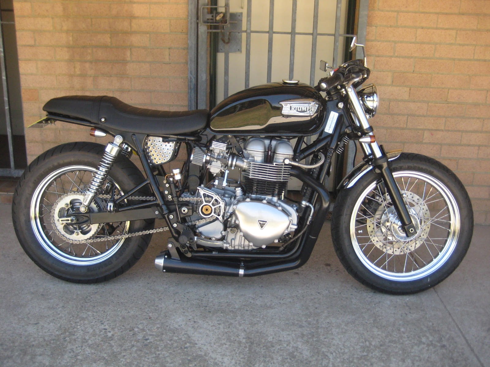This one is FOR SALE……(see website for details) Sticky 180 tyres on the back makes this thing a beast around corners, along with “special” tyre warmers the exhaust, with an agressive stance this is not for the faint hearted. 2008 Triumph Bonneville T100 . with 3000kms on the clock — this bike has been in work shop for over 6 months, Most parts on bike are one off, or has been customised in some way -You will notice that it has a one off rim on the rear to accommodate the 180 size tires along with custom uprated shocks,custom made short brake/clutch levers, custom foot pegs, custom paint, custom front fender, bates head light, alloy blinkers, custom one off clipons and top bridge to match, custom speedo, tank has been customised to fit, one off fibreglass seat/belly pan, one off exhaust system, odyssey battery, whole bike rewired, air breather/filter dyno tuned and calibrated. A whole lot more has been done you really need to see this for yourself to appreciate.