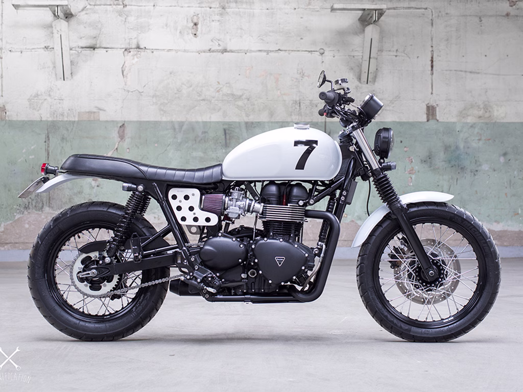 As you would expect there has been a degree of tidying, with the replacing of stock indicators and moving the rectifier from the front yoke to the frame. Something which should be done before the bikes leave the factory. The bloated rear mudguard and taillight have also been relocated, but in their case to the skip, being replaced with a custom mudguard and a black Easyriders vintage taillight. Finishing the bike off is the light grey metallic petrol tank, which has been fitted with a Motone fuel cap. All the chrome parts have been blacked out or dulled down continuing the Scramblers minimalistic appearance.