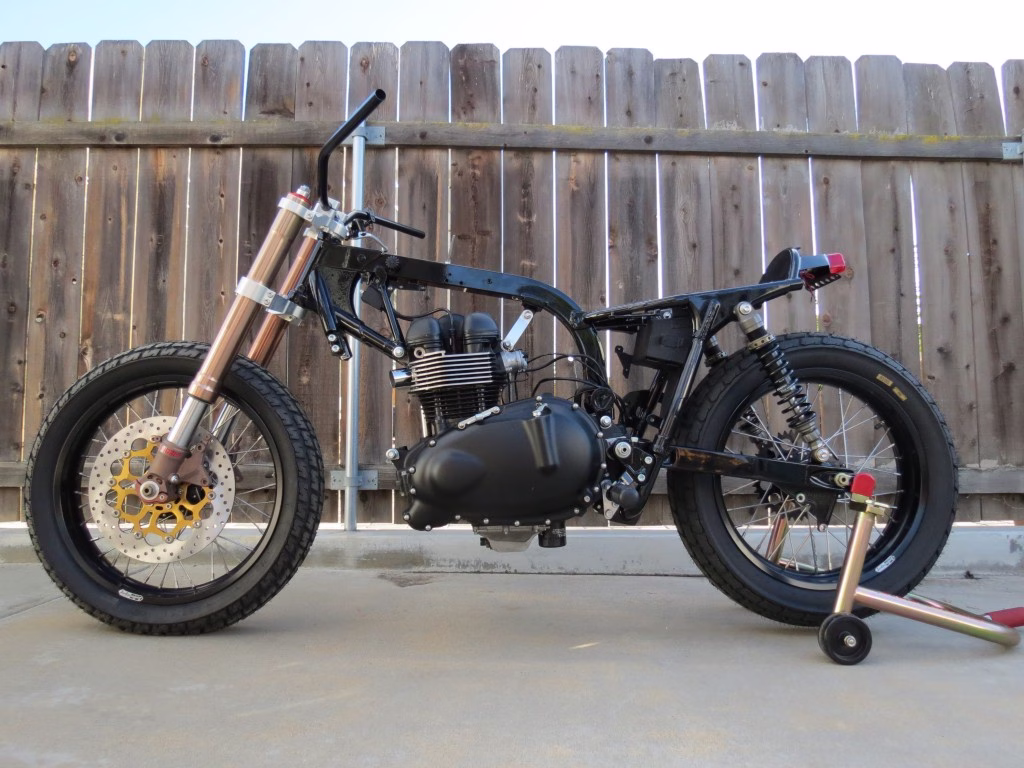 Next up is the cutting of the frame and the fitting of the Mule Tracker seat kit which comprises of a cleverly designed bold on tail section and all the part you need to make you Twin look like a fully fledged Flat Tracker.