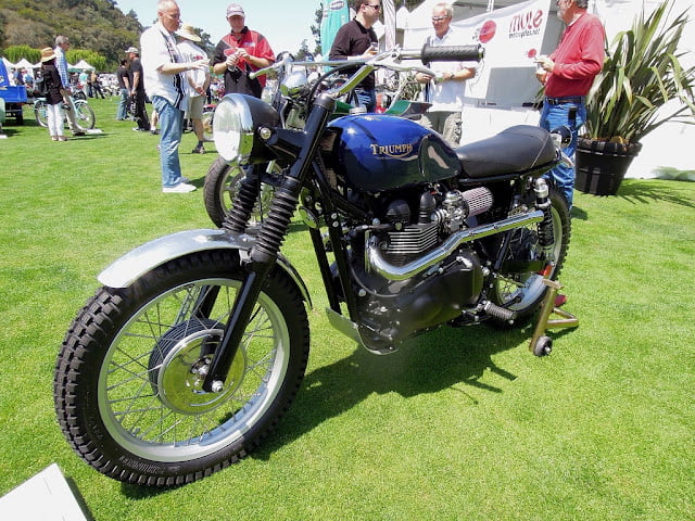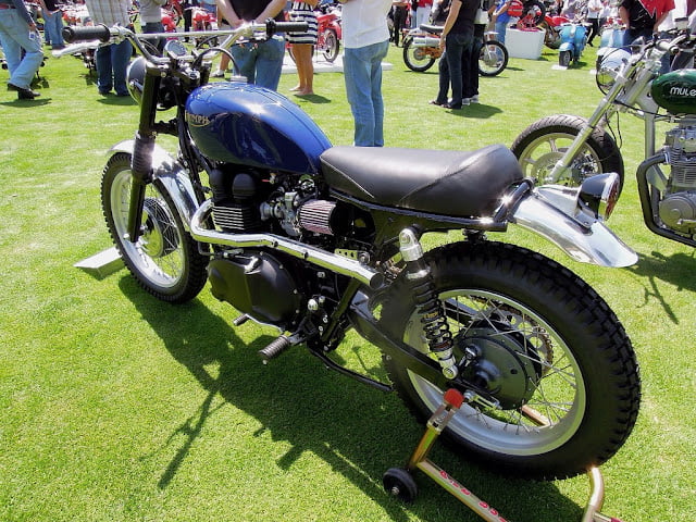 What was changed? Wheels have drum brakes, BMW front and XS650 rear with Sun rims, (custom made) aluminum tank, seat, fenders, rear frame section was modified, stainless pipes, K&N filters which will actually be increased in size, CZ handlebars, YZ490 Yamaha controls, small electronic speedo unit, tail light, tubular side stand as opposed to the 12lb solid steel stock unit, Racetech shocks, upgraded ignition unit and aluminum skid-plate.Looks good to me!… though those drum brakes raise an eyebrow!