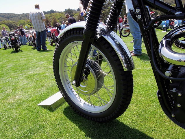 What was changed? Wheels have drum brakes, BMW front and XS650 rear with Sun rims, (custom made) aluminum tank, seat, fenders, rear frame section was modified, stainless pipes, K&N filters which will actually be increased in size, CZ handlebars, YZ490 Yamaha controls, small electronic speedo unit, tail light, tubular side stand as opposed to the 12lb solid steel stock unit, Racetech shocks, upgraded ignition unit and aluminum skid-plate.Looks good to me!… though those drum brakes raise an eyebrow!