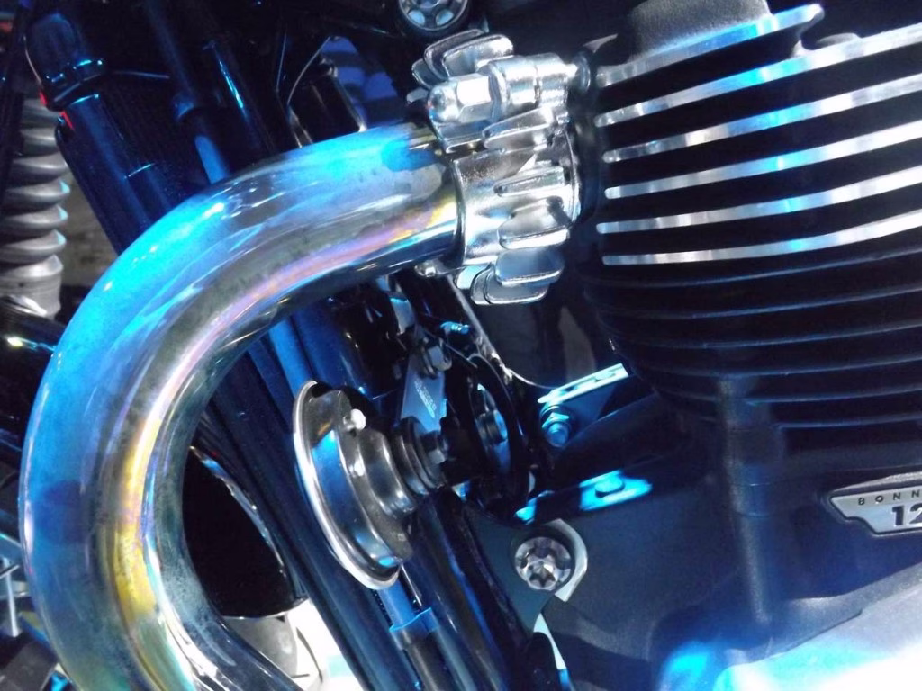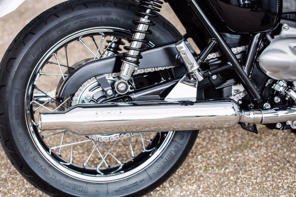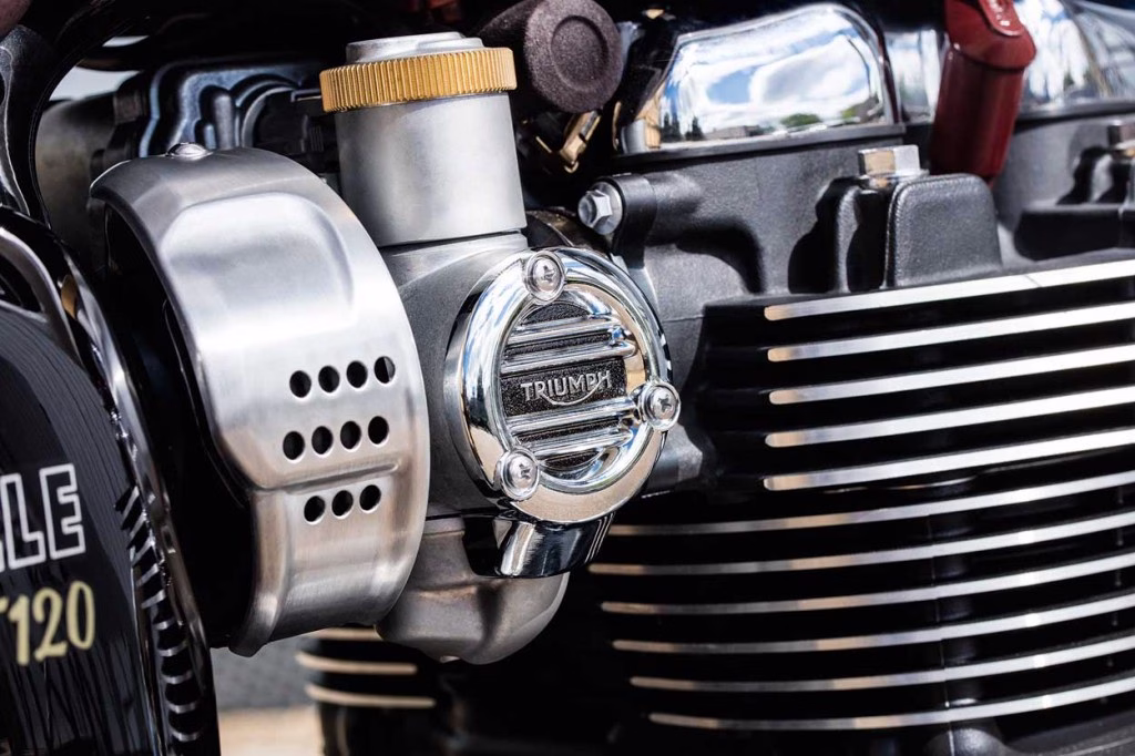 For the T120 and T120 black you have the ‘Prestige‘ Kit which comprises of, an Authentic chrome ‘4 bar’ tank badge (which I really like the look of ) Ribbed and stitched black seat, Compact LED indicators, Chrome Vance & Hines peashooter slip on silencers, Black ‘Barrel style’ handlebar grips and Chrome clutch cover, alternator cover and throttle body embellishers… woof!