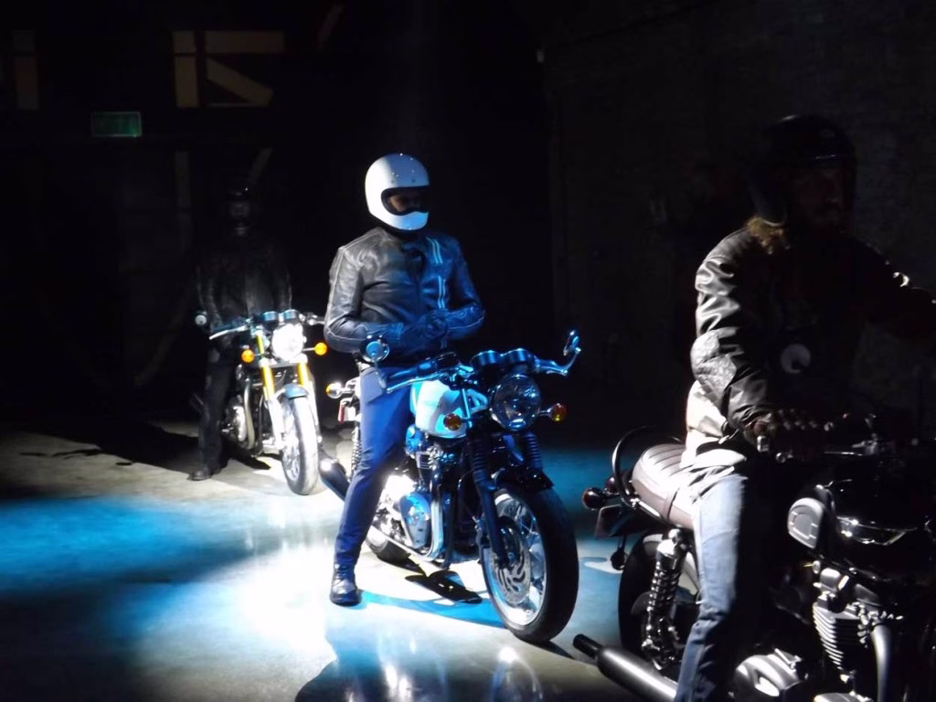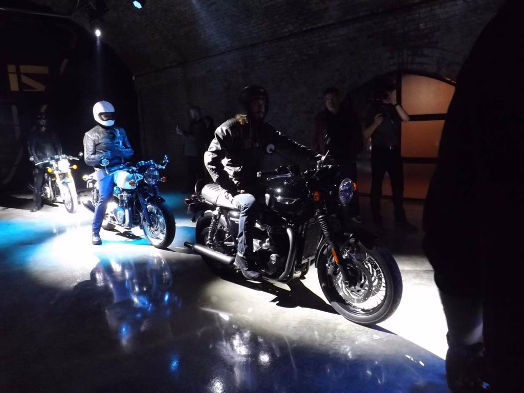 I was lucky enough to be invited by Triumph to the Bonneville launch party on the 28th were I got to see these bikes in the flesh. The evening started with history and background behind Triumph and the introduction to some of the people behind the bikes development. The five bikes were then ridden out into a small crowd of fellow motorcycle bloggers, only lit by cool blue mood lighting, which was s bit of a shame as my camera really sucks in the dark. But that aside the bikes sounded amazing in the confines of the railway arches and looked just as good. It was clear from the off just how new these bikes were.