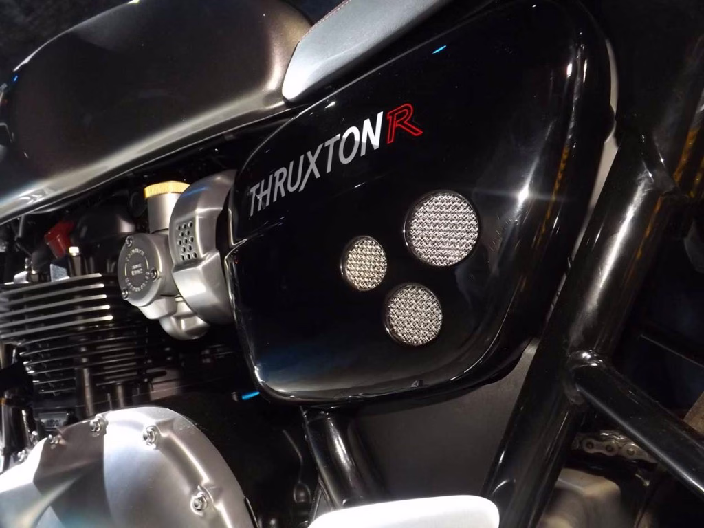 Other nice detailing include the fins on the exhausts and vent holes on the Thuxton’s side covers, which help with breathing — holes which have been reproduced on the right hand side covers, though these are just for show. The horn I also noted is now behind the left hand exhausts header, with the rectifier being moved to underneath the bike on the Thruxtons (see pic).