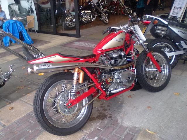 …. this one rides into mine. Stuck at lights in my home town of Christchurch, when what should ride past me but the Blondeel Tracker as posted on this blog and on the MCN website. It’s not easy following a bike in heavy traffic, but a police car helped a little by slowing the bike down long enough for me to gauge where it was heading. I caught up with the bike outside Battistinis The bike now lives locally, so should be seeing quiet a bit of it.