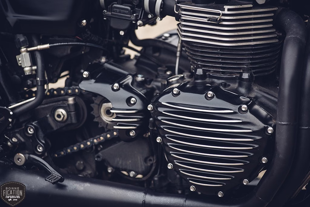 Finishing the Tracker look off a treat, though an expensive one, are a set of forged billet aluminum, black anodized, 19” Flurry wheels from Arlan Ness, fitted to the bike using a set of one-off Triumph hub. The wheels were then fitted with Maxxis DTR dirt track tires (27×7.0-19 front / 27.5×7.5-19 rear.