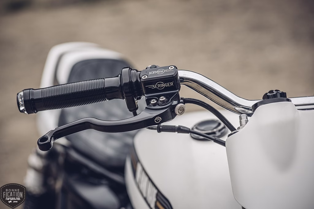 Like all good craftsmen, Chun’s fabrication skill didn’t stop at crafting the tank, seat and number board, but also include the super cool, black 2>2 Tracker exhausts system, which look fantastic when paired with a set Speed Merchant ribbed engine covers. As you would expect the braking was inproved with the addition of a full Beringer system and levers with integrated micro switches.