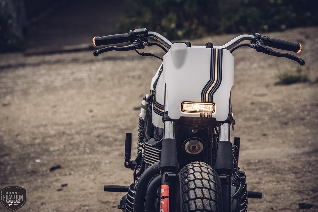 Much like any popular style, a good Tracker needs to follow a blueprint, it should preferably sit on a set of 19″ wheels, shod with Maxxis tires and sport a XR750 or similar seat cowl — the tank should be thin and sleek, allowing the rider to hug the bike as closely as possible and finally the handlebars should be the classic backswept Tracker bars.