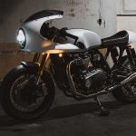 A dented and rusty1970’s Triumph Tank was sourced, reconditioned and made to fit the modern Hinckley frame, adding a very cool classic Triumph vibe.